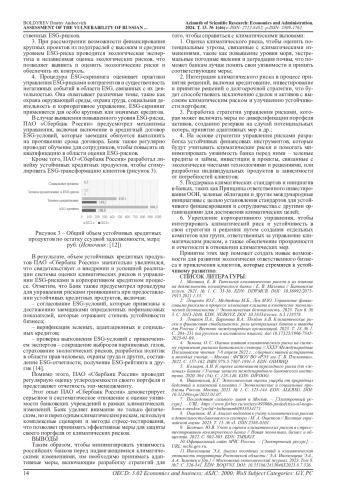 Результаты исследования показывают значительное увеличение объема устойчивых кредитных продуктов ПАО «Сбербанк России», что свидетельствует об успешной реализации системы оценки климатических рисков и управлении ESG-рисками. Теоретическая значимость работы заключается в анализе проблем, связанных с рисковым анализом и управлением климатическими изменениями в банковском секторе. Практическая значимость статьи состоит в предложении подходов к управлению климатическими рисками и разработке устойчивых финансовых инструментов в контексте климатических изменений.