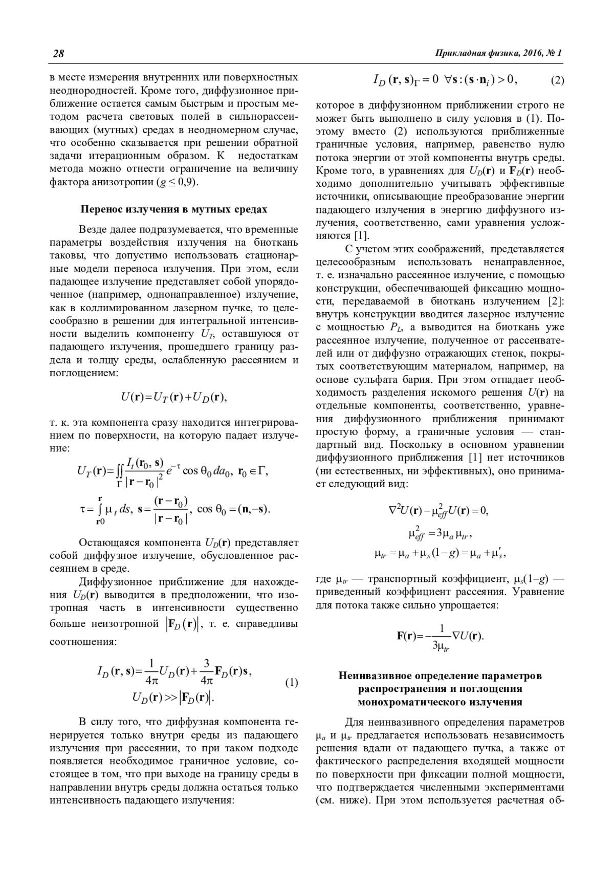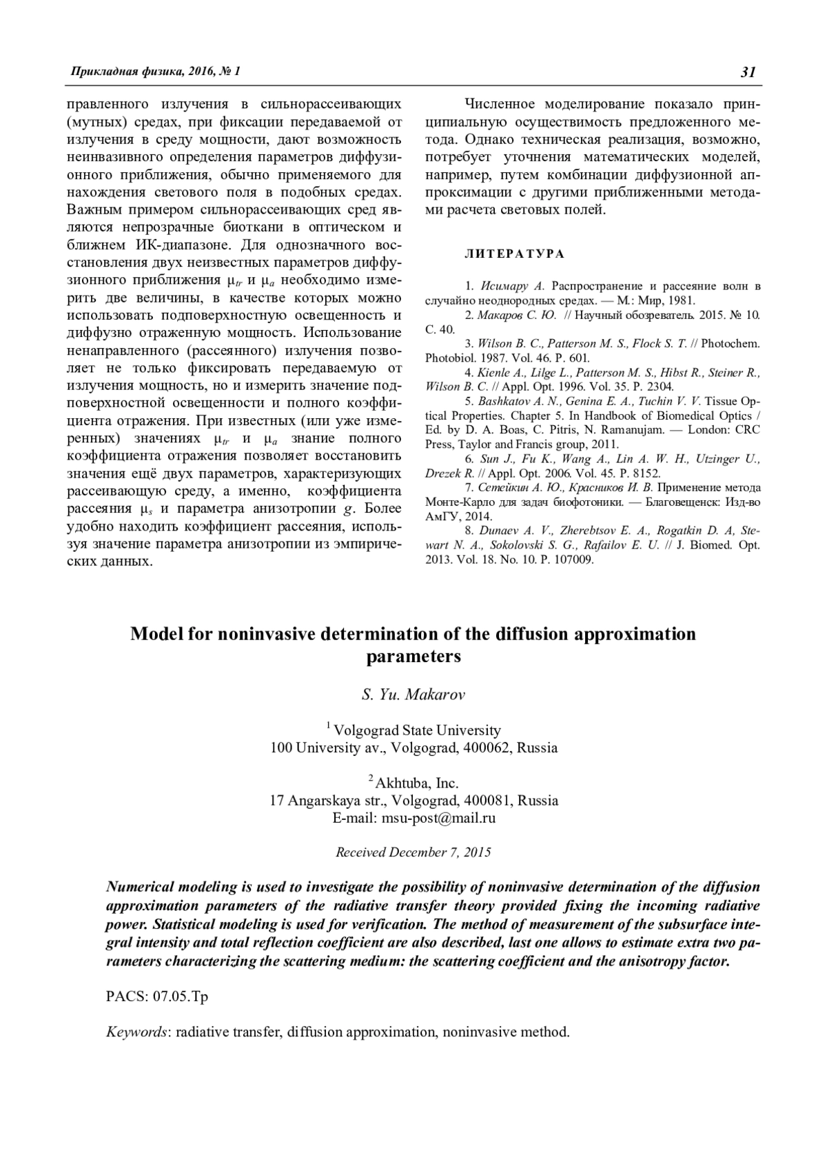 Макаров С. Ю. Модель для неинвазивного определения параметров диффузионного приближения 27