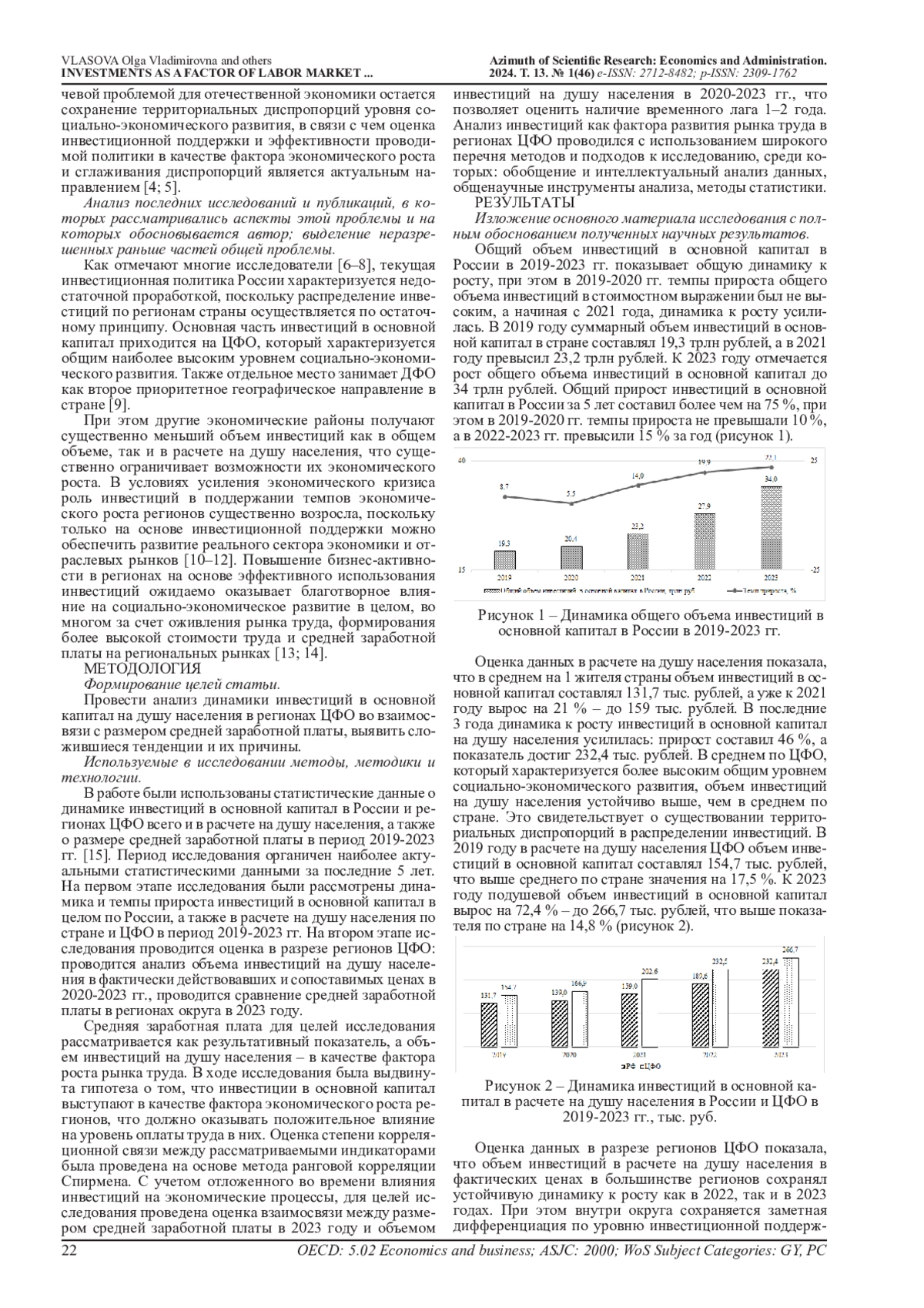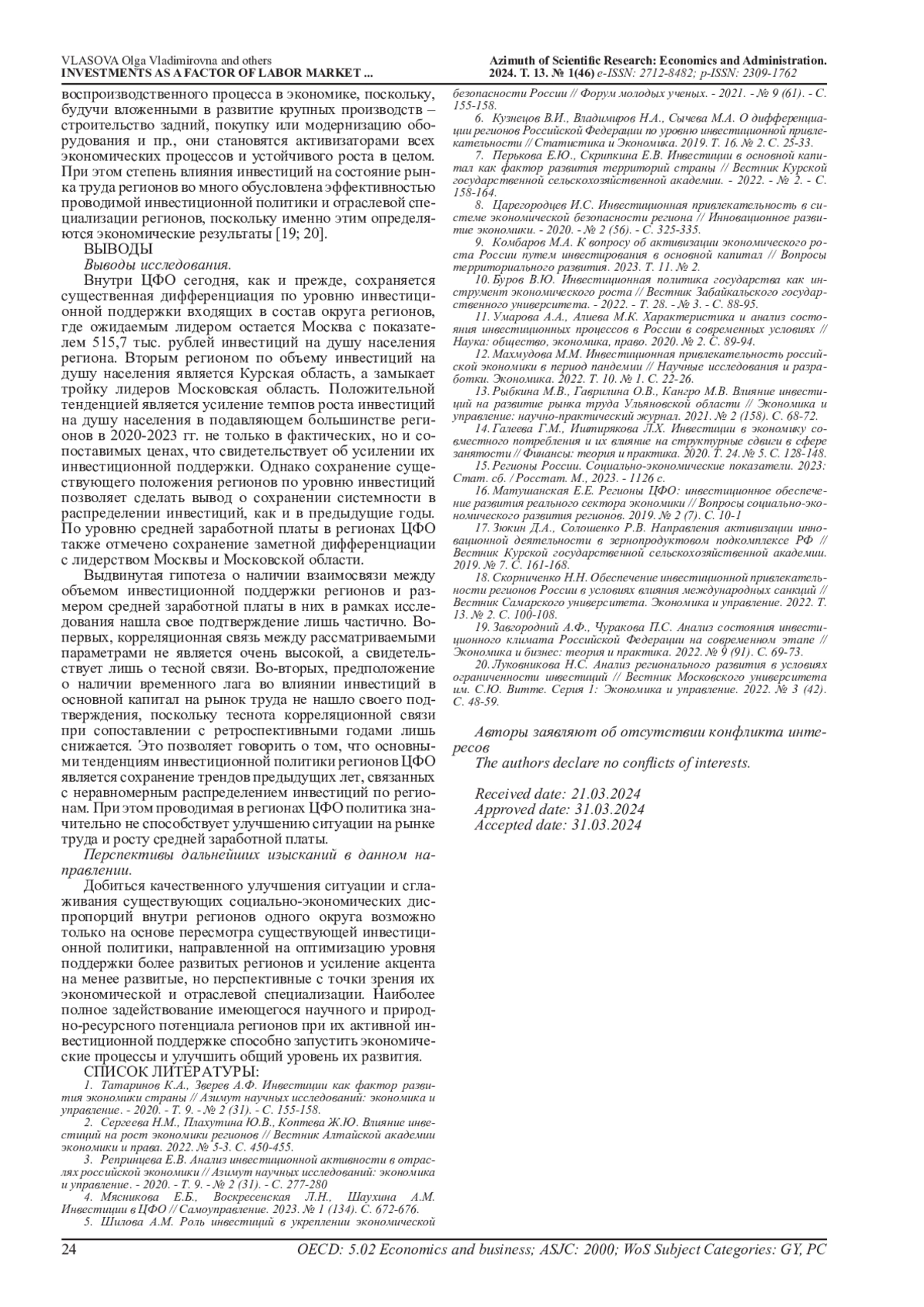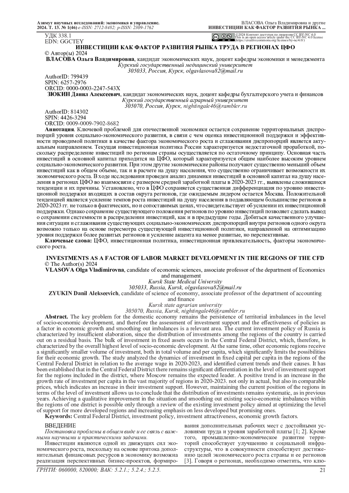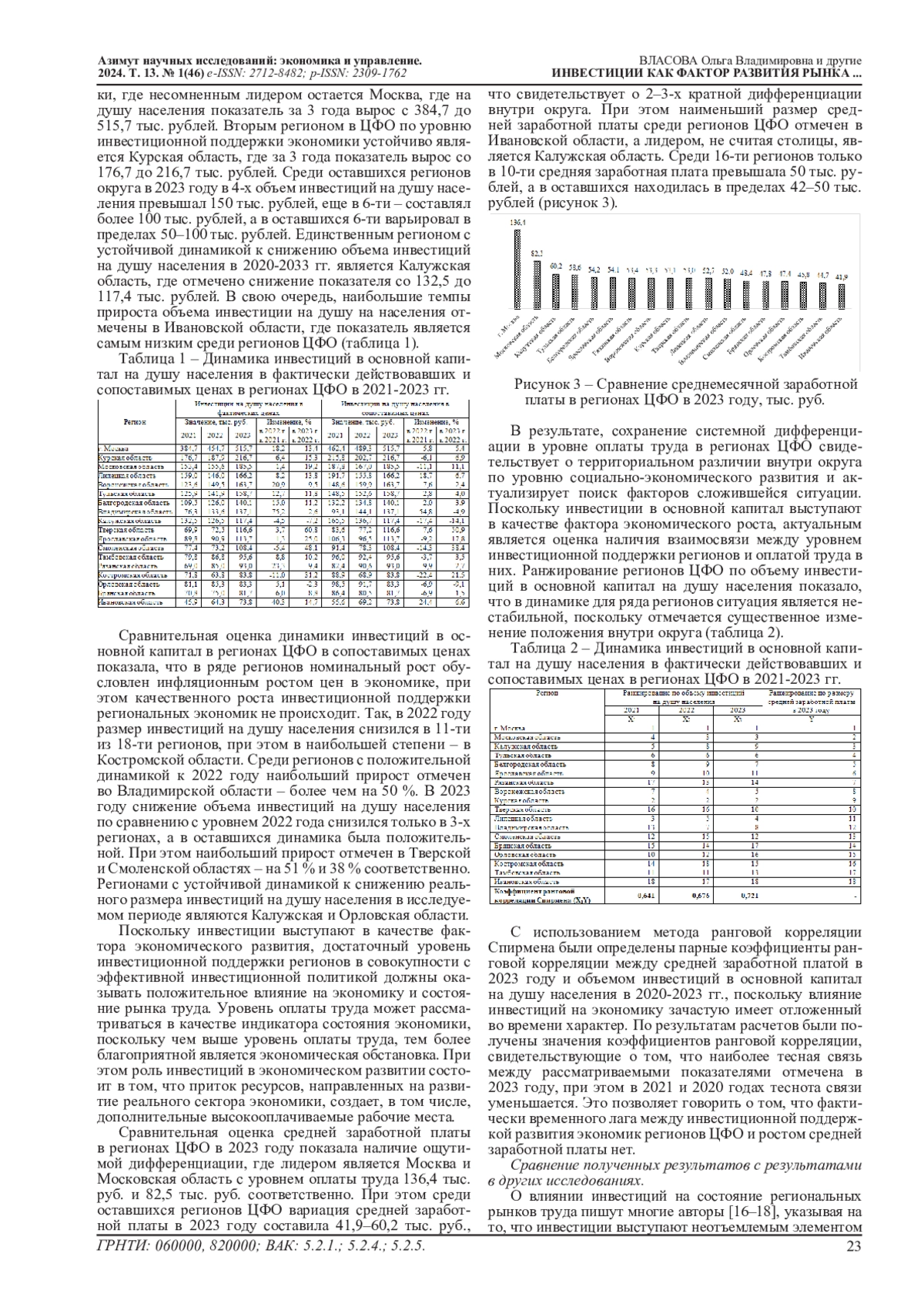 Ключевой проблемой для отечественной экономики остается сохранение территориальных диспропорций уровня социально-экономического развития, в связи с чем оценка инвестиционной поддержки и эффективности проводимой политики в качестве фактора экономического роста и сглаживания диспропорций является актуальным направлением. Текущая инвестиционная политика России характеризуется недостаточной проработкой, поскольку распределение инвестиций по регионам страны осуществляется по остаточному принципу. Основная часть инвестиций в основной капитал приходится на ЦФО, который, итак, характеризуется общим наиболее высоким уровнем социально-экономического развития. При этом другие экономические районы получают существенно меньший объем инвестиций как в общем объеме, так и в расчете на душу населения, что существенно ограничивает возможности их экономического роста. В ходе исследования проведен анализ динамики инвестиций в основной капитал на душу населения в регионах ЦФО во взаимосвязи с размером средней заработной платы в 2020-2023 гг., выявлены сложившиеся тенденции и их причины. Установлено, что в ЦФО сохраняется существенная дифференциация по уровню инвестиционной поддержки входящих в состав округа регионов, где ожидаемым лидером остается Москва. Положительной тенденцией является усиление темпов роста инвестиций на душу населения в подавляющем большинстве регионов в 2020-2023 гг. не только в фактических, но и сопоставимых ценах, что свидетельствует об усилении их инвестиционной поддержки. Однако сохранение существующего положения регионов по уровню инвестиций позволяет сделать вывод о сохранении системности в распределении инвестиций, как и в предыдущие годы. Добиться качественного улучшения ситуации и сглаживания существующих социально-экономических диспропорций внутри регионов одного округа возможно только на основе пересмотра существующей инвестиционной политики, направленной на оптимизацию уровня поддержки более развитых регионов и усиление акцента на менее развитые, но перспективные.