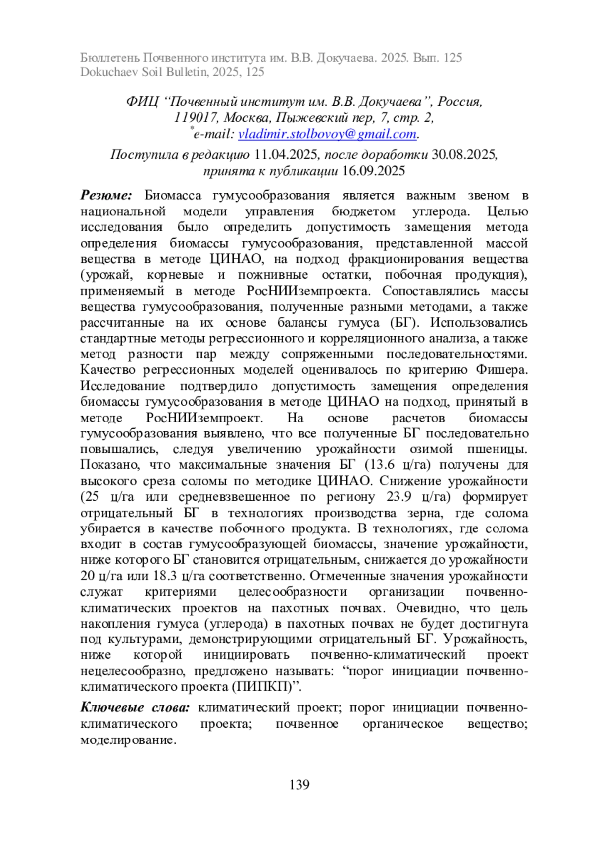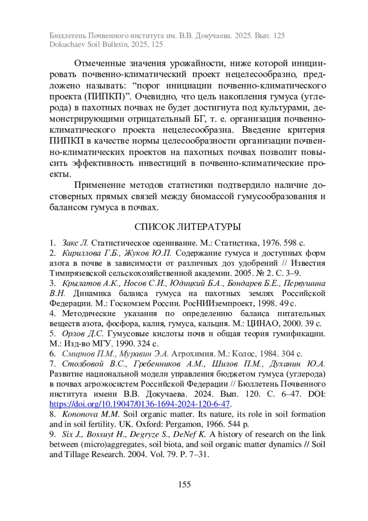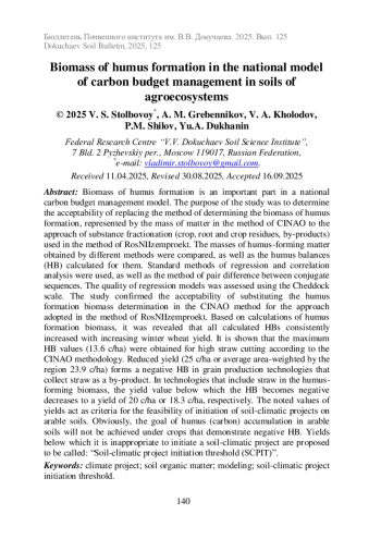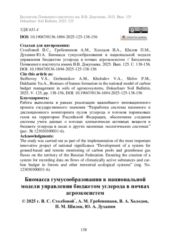 7. Столбовой В.С., Гребенников А.М., Шилов П.М., Духанин Ю.А. Развитие национальной модели управления бюджетом гумуса (углерода) в почвах агроэкосистем Российской Федерации // Бюллетень Почвенного института имени В.В. Докучаева. 2024. Вып. 120. С. 6-47. DOI: 10.19047/0136-1694-2024-120-6-47