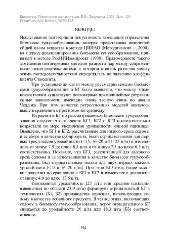 Биомасса гумусообразования является важным звеном в национальной модели управления бюджетом углерода. Целью исследования было определить допустимость замещения метода определения биомассы гумусообразования, представленной массой вещества в методе ЦИНАО, на подход фракционирования вещества (урожай, корневые и пожнивные остатки, побочная продукция), применяемый в методе РосНИИземпроекта. Сопоставлялись массы вещества гумусообразования, полученные разными методами, а также рассчитанные на их основе балансы гумуса (БГ). Использовались стандартные методы регрессионного и корреляционного анализа, а также метод разности пар между сопряженными последовательностями. Качество регрессионных моделей оценивалось по критерию Фишера. Исследование подтвердило допустимость замещения определения биомассы гумусообразования в методе ЦИНАО на подход, принятый в методе РосНИИземпроект. На основе расчетов биомассы гумусообразования выявлено, что все полученные БГ последовательно повышались, следуя увеличению урожайности озимой пшеницы. Показано, что максимальные значения БГ (13.6 ц/га) получены для высокого среза соломы по методике ЦИНАО. Снижение урожайности (25 ц/га или средневзвешенное по региону 23.9 ц/га) формирует отрицательный БГ в технологиях производства зерна, где солома убирается в качестве побочного продукта. В технологиях, где солома входит в состав гумусообразующей биомассы, значение урожайности, ниже которого БГ становится отрицательным, снижается до урожайности 20 ц/га или 18.3 ц/га соответственно. Отмеченные значения урожайности служат критериями целесообразности организации почвенно-климатических проектов на пахотных почвах. Очевидно, что цель накопления гумуса (углерода) в пахотных почвах не будет достигнута под культурами, демонстрирующими отрицательный БГ. Урожайность, ниже которой инициировать почвенно-климатический проект нецелесообразно, предложено называть: “порог инициации почвенно-климатического проекта (ПИПКП)”.