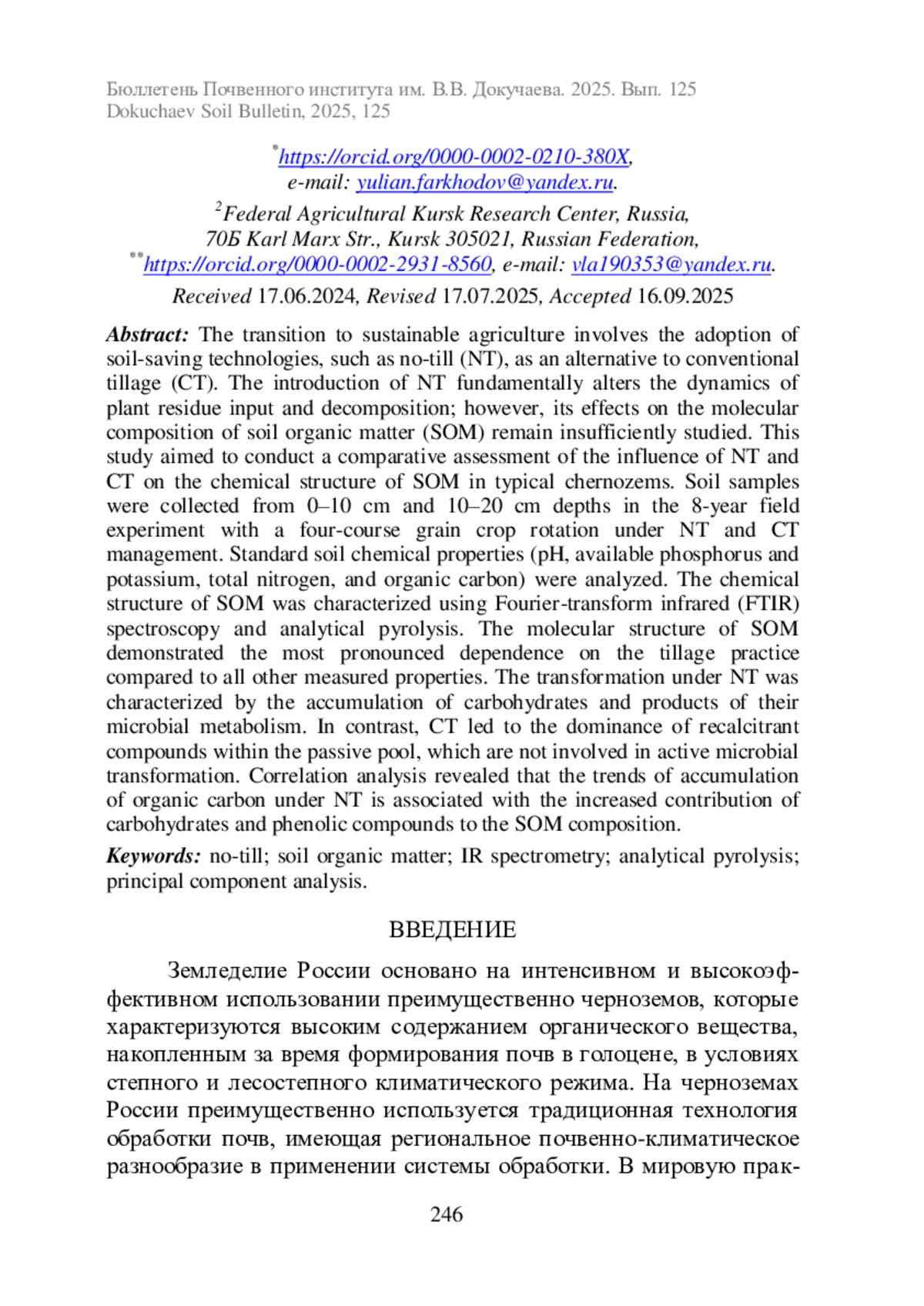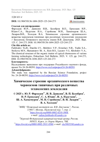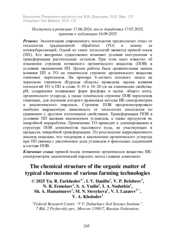 14. Холодов В.А., Фарходов Ю.Р., Ярославцева Н.В., Айдиев А.Ю., Лазарев В.И., Ильин Б.С., Иванов А.Л., Куликова Н.А. Термолабильное и термостабильное органическое вещество черноземов разного землепользования // Почвоведение. 2020. T. 8. C. 970-982.