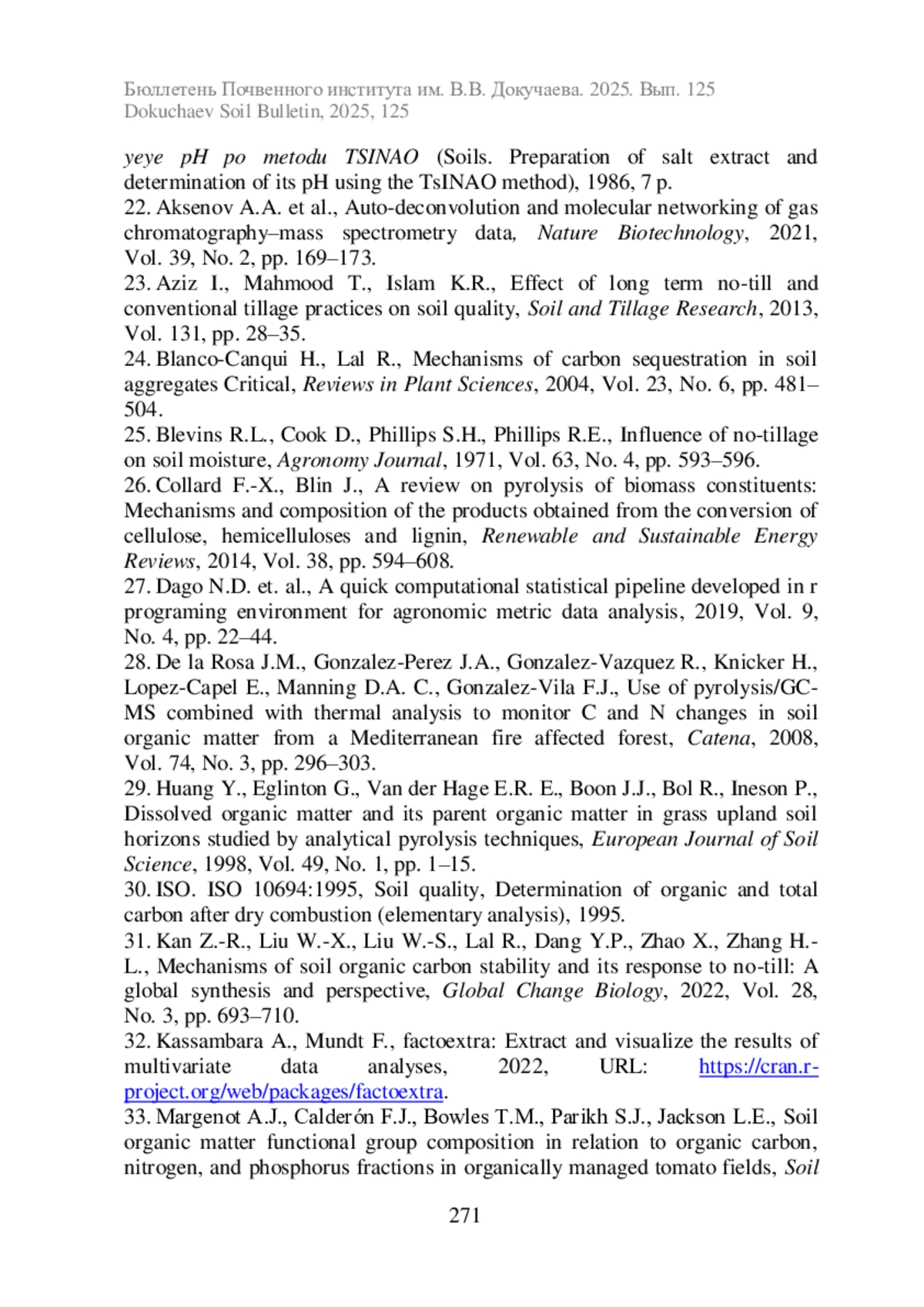 31. Kan Z.-R., Liu W.-X., Liu W.-S., Lal R., Dang Y.P., Zhao X., Zhang H.-L. Mechanisms of soil organic carbon stability and its response to no-till: A global synthesis and perspective // Global Change Biology. 2022. Vol. 28. No. 3. P. 693-710.