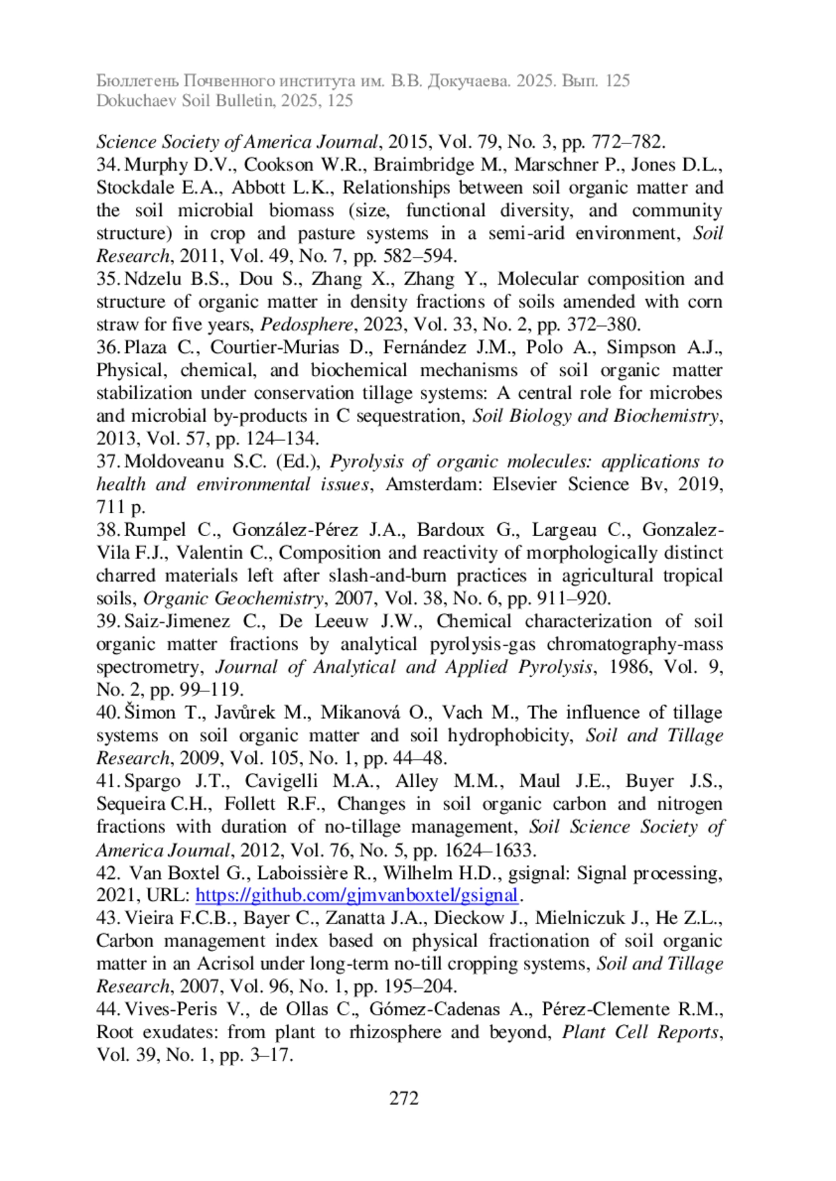 36. Plaza C., Courtier-Murias D., Fernández J.M., Polo A., Simpson A.J. Physical, chemical, and biochemical mechanisms of soil organic matter stabilization under conservation tillage systems: A central role for microbes and microbial by-products in C sequestration // Soil Biology and Biochemistry. 2013. Vol. 57. P. 124-134.