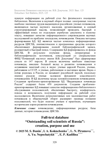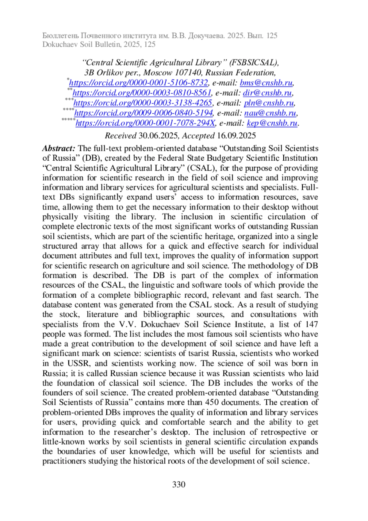 Рассмотрена полнотекстовая проблемно-ориентированная база данных (БД) “Выдающиеся почвоведы России”, созданная Федеральным государственным бюджетным научным учреждением “Центральная научная сельскохозяйственная библиотека” (ЦНСХБ) с целью информационного обеспечения научных исследований в области почвоведения и совершенствования информационно-библиотечного обслуживания ученых и специалистов АПК. Полнотекстовые БД значительно расширяют возможности доступа пользователей к информационным ресурсам, экономят их время, позволяя получить нужную информацию на рабочий стол без физического посещения библиотеки. Включение в научный оборот полных электронных текстов наиболее значимых трудов выдающихся российских ученых почвоведов, являющихся частью научного наследия, организованных в единый структурированный массив, позволяющий проводить быстрый и эффективный поиск по отдельным атрибутам документа и полному тексту, повышает качество информационного сопровождения научных исследований по проблеме земледелия, почвоведения. Описана методика формирования БД. БД является частью комплекса информационных ресурсов ЦНСХБ, лингвистические и программные средства которого обеспечивают формирование полной библиографической записи, релевантный и быстрый поиск. Содержание БД формировалось из фонда ЦНСХБ. В результате изучения фонда, литературных и библиографических источников, консультаций со специалистами ФИЦ “Почвенный институт имени В. В. Докучаева” был сформирован список из 147 персон. В список включены наиболее известные почвоведы, внесшие большой вклад в развитие почвоведения и оставившие заметный след в науке: ученые царской России, ученые, работавшие в СССР, и ученые, работающие в настоящее время. Наука о почве родилась в России, ее называют российской наукой, поскольку именно русские ученые заложили фундамент классического почвоведения. В БД включены труды основоположников почвоведения. Созданная проблемно-ориентированная БД “Выдающиеся почвоведы России” содержит более 450 документов. Создание проблемно-ориентированных БД повышает качество информационно-библиотечного обслуживания пользователей, обеспечивая быстроту, комфортность поиска и возможность получения информации на рабочий стол исследователя. Включение ретроспективных или малоизвестных работ почвоведов в общенаучный оборот расширяет границы познания пользователей, что будет полезно ученым и практикам, изучающим исторические корни развития почвоведения.