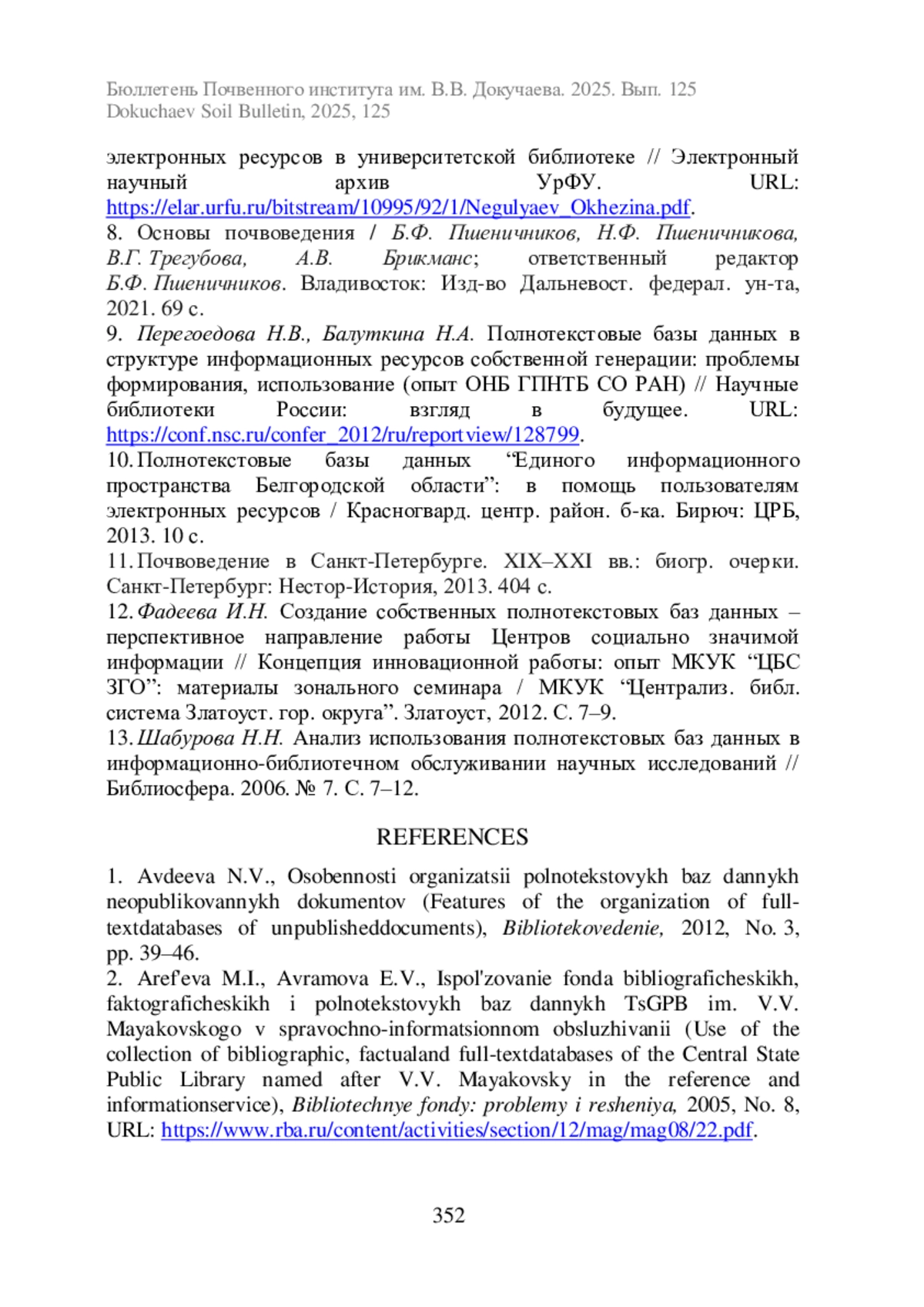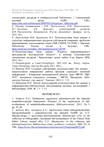 1. Авдеева Н.В. Особенности организации полнотекстовых баз данных неопубликованных документов // Библиотековедение. 2012. № 3. С. 39-46.