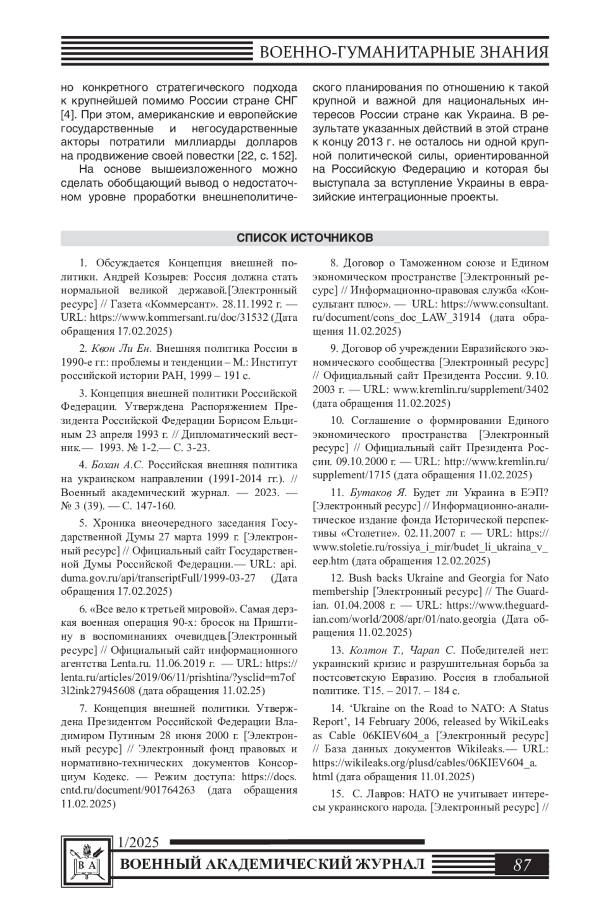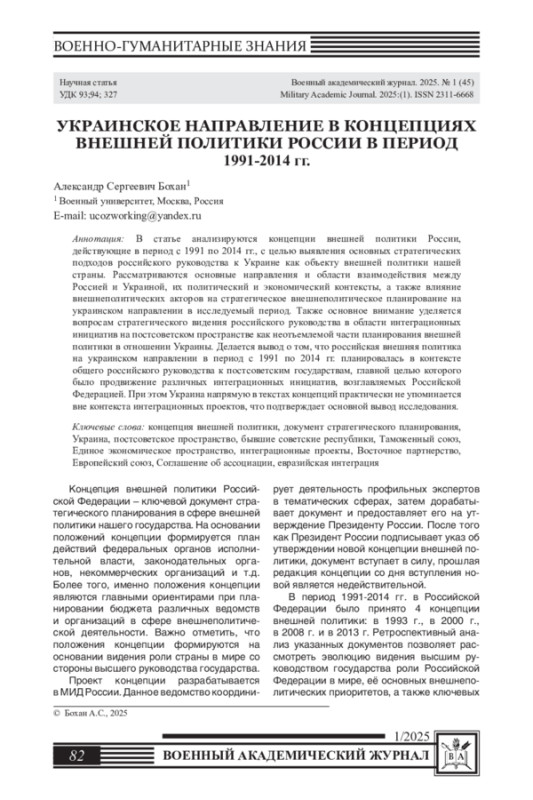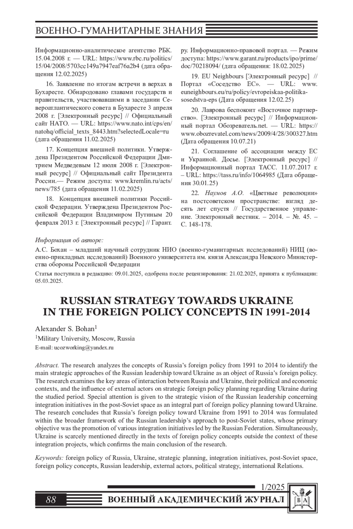 4. Бохан А.С. Российская внешняя политика на украинском направлении (1991-2014 гг.). // Военный академический журнал. - 2023. - № 3 (39). - С. 147-160. EDN: LJSTCI