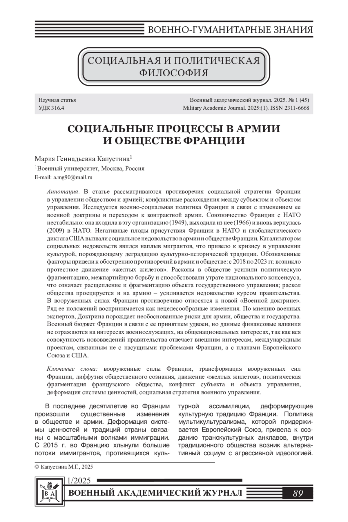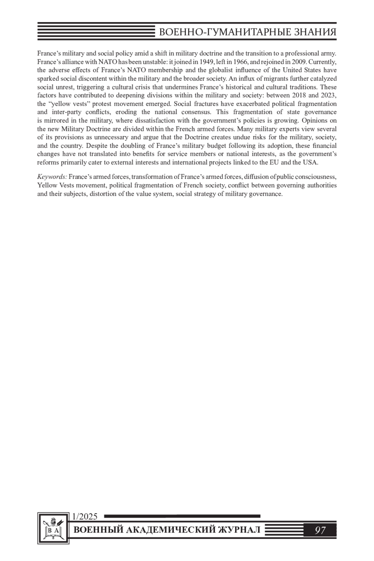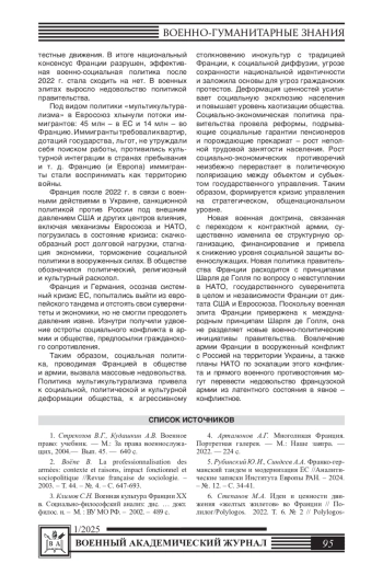 В статье рассматриваются противоречия социальной стратегии Франции в управлении обществом и армией; конфликтные расхождения между субъектом и объектом управления. Исследуется военно-социальная политика Франции в связи с изменением ее военной доктрины и переходом к контрактной армии. Союзничество Франции с НАТО нестабильно: она входила в эту организацию (1949), выходила из нее (1966) и вновь вернулась (2009) в НАТО. Негативные плоды присутствия Франции в НАТО и глобалистического диктата США вызвали социальное недовольство в армии и обществе Франции. Катализатором социальных недовольств явился наплыв мигрантов, что привело к кризису в управлении культурой, порождающему деградацию культурно-исторической традиции. Обозначенные факторы привели к обострению противоречий в армии и обществе: с 2018 по 2023 гг. возникло протестное движение «желтых жилетов». Расколы в обществе усилили политическую фрагментацию, межпартийную борьбу и способствовали утрате национального консенсуса, что означает расщепление и фрагментацию объекта государственного управления; раскол общества проецируется и на армию - усиливается недовольство курсом правительства. В вооруженных силах Франции противоречиво относятся к новой «Военной доктрине». Ряд ее положений воспринимается как нецелесообразные изменения. По мнению военных экспертов, Доктрина порождает необоснованные риски для армии, общества и государства. Военный бюджет Франции в связи с ее принятием удвоен, но данные финансовые влияния не отражаются на интересах военнослужащих, на общенациональных интересах, так как вся совокупность нововведений правительства отвечает внешним интересам, международным проектам, связанным не с насущными проблемами Франции, а с планами Европейского Союза и США.