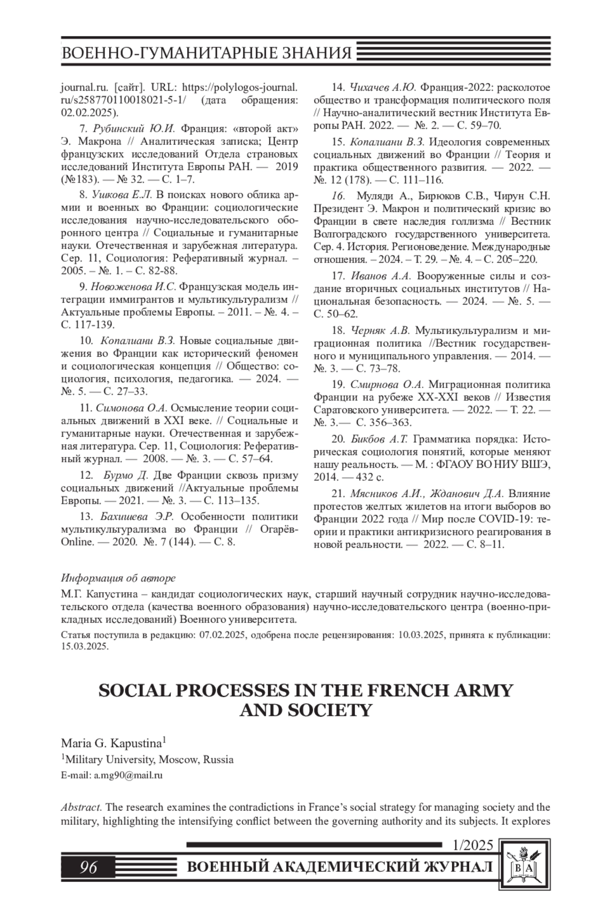 8. Ушкова Е.Л. В поисках нового облика армии и военных во Франции: социологические исследования научно-исследовательского оборонного центра // Социальные и гуманитарные науки. Отечественная и зарубежная литература. Сер. 11, Социология: Реферативный журнал. -2005. - №. 1. - С. 82-88. EDN: HLDBWF