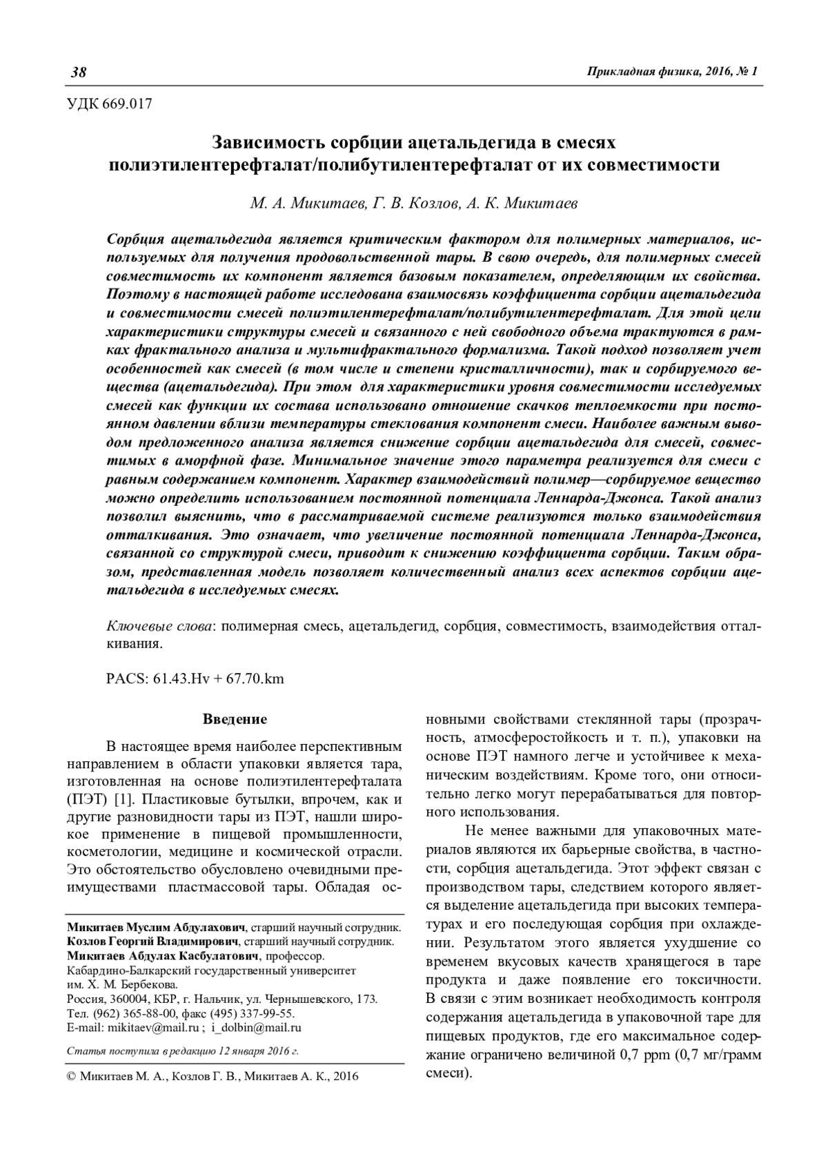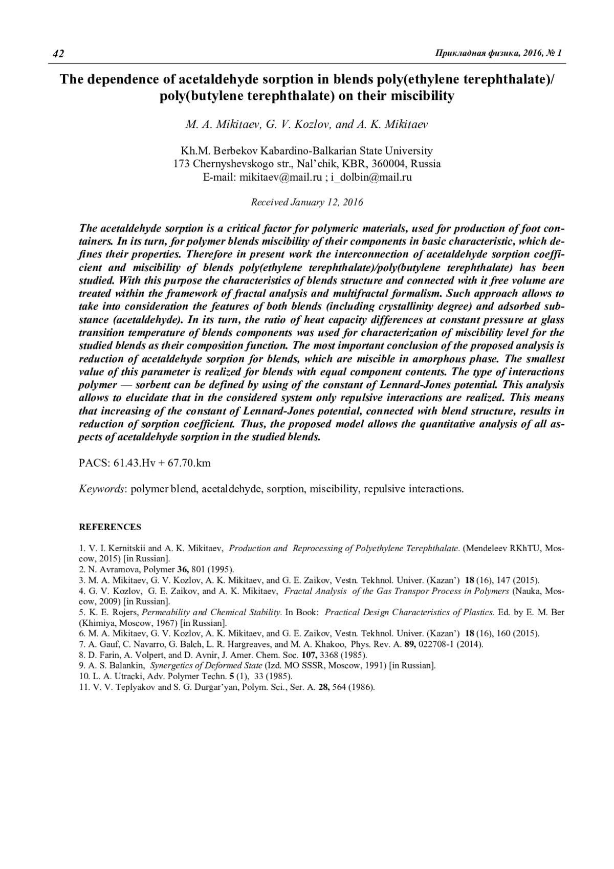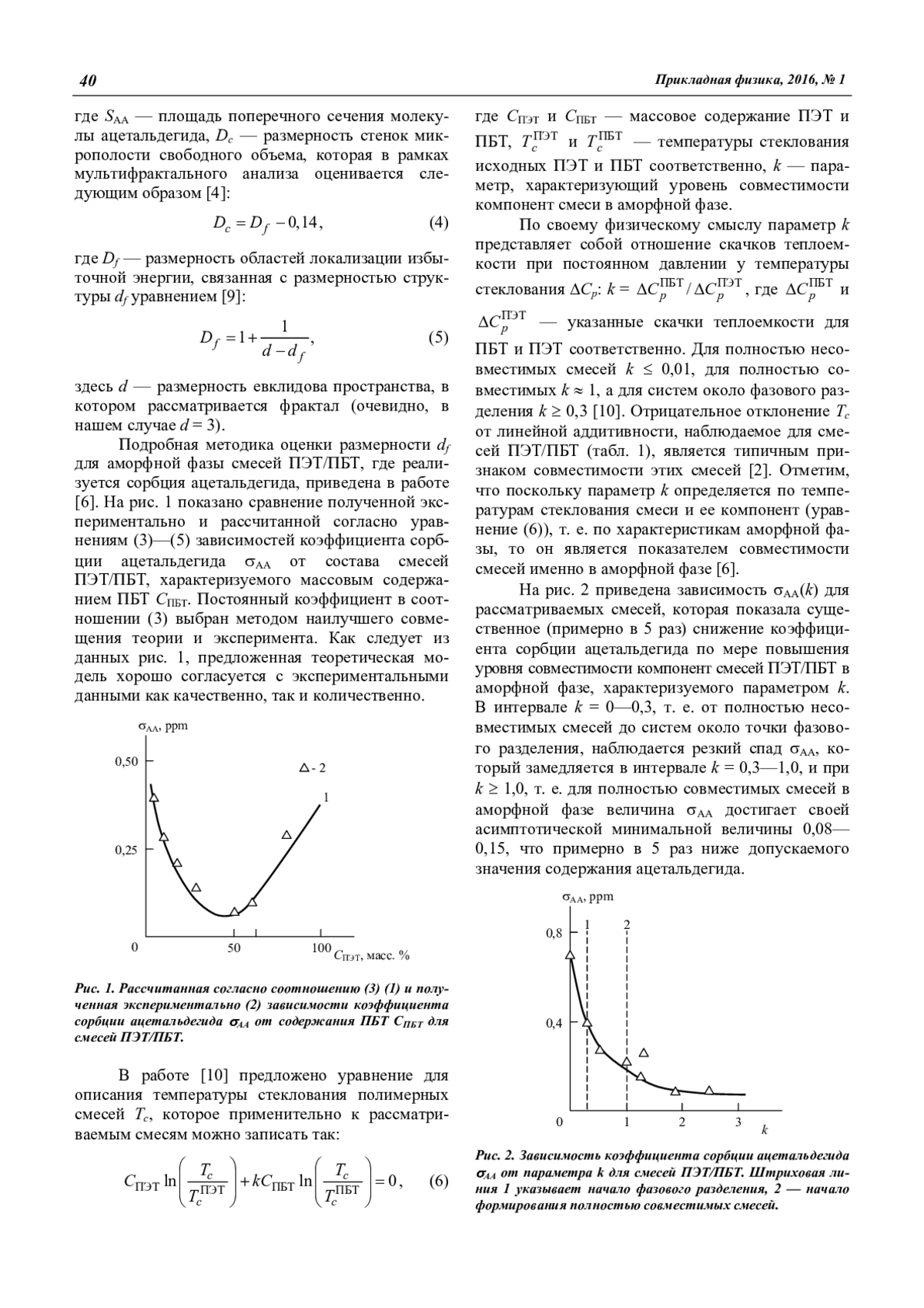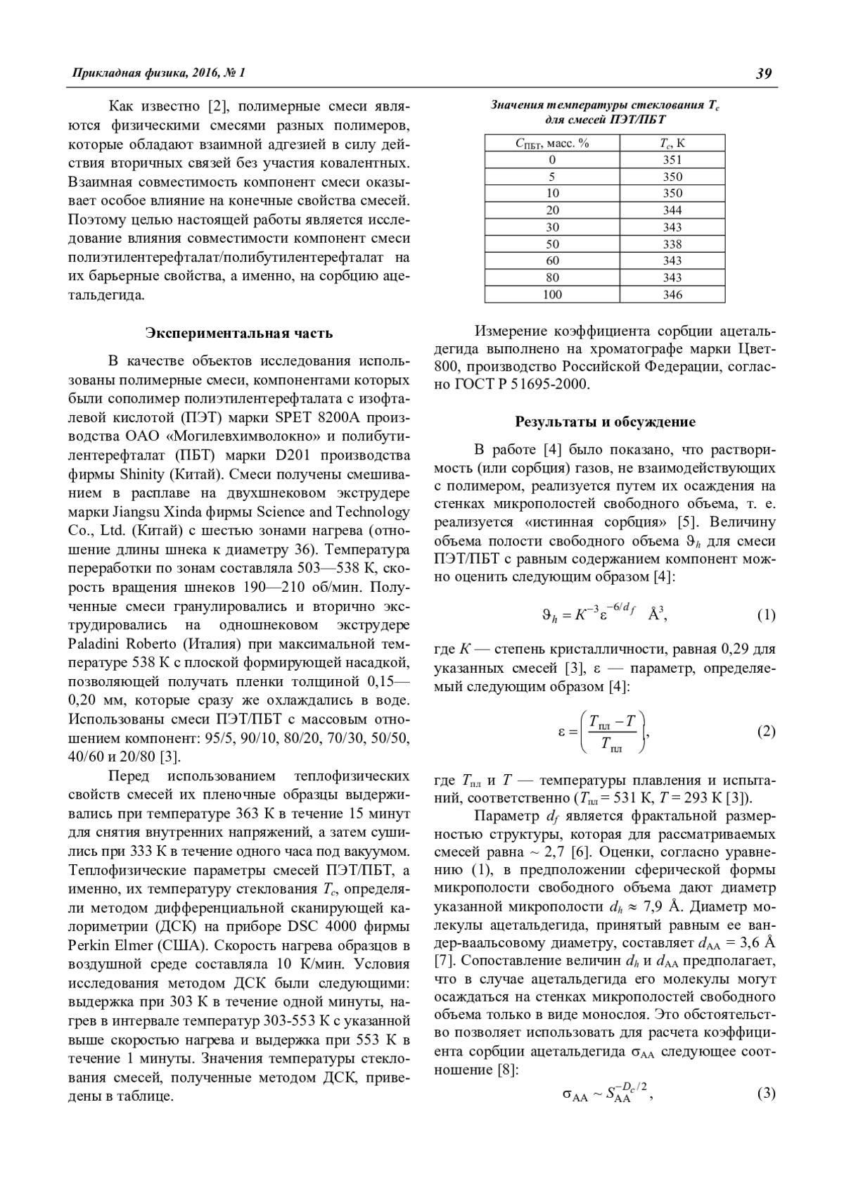 Сорбция ацетальдегида является критическим фактором для полимерных материалов, используемых для получения продовольственной тары. В свою очередь, для полимерных смесей совместимость их компонент является базовым показателем, определяющим их свойства. Поэтому в настоящей работе исследована взаимосвязь коэффициента сорбции ацетальдегида и совместимости смесей полиэтилентерефталат/полибутилентерефталат. Для этой цели характеристики структуры смесей и связанного с ней свободного объема трактуются в рамках фрактального анализа и мультифрактального формализма. Такой подход позволяет учет особенностей как смесей (в том числе и степени кристалличности), так и сорбируемого вещества (ацетальдегида). При этом для характеристики уровня совместимости исследуемых смесей как функции их состава использовано отношение скачков теплоемкости при постоянном давлении вблизи температуры стеклования компонент смеси. Наиболее важным выводом предложенного анализа является снижение сорбции ацетальдегида для смесей, совместимых в аморфной фазе. Минимальное значение этого параметра реализуется для смеси с равным содержанием компонент. Характер взаимодействий полимер—сорбируемое вещество можно определить использованием постоянной потенциала Леннарда-Джонса. Такой анализ позволил выяснить, что в рассматриваемой системе реализуются только взаимодействия отталкивания. Это означает, что увеличение постоянной потенциала Леннарда-Джонса, связанной со структурой смеси, приводит к снижению коэффициента сорбции. Таким образом, представленная модель позволяет количественный анализ всех аспектов сорбции ацетальдегида в исследуемых смесях.