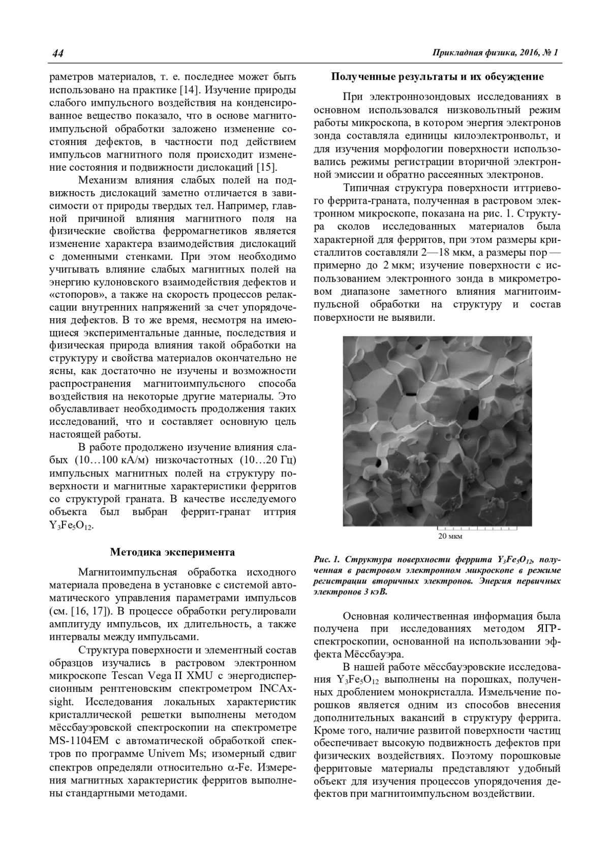 Методами растровой электронной микроскопии и мессбауэровской спектроскопии изучено влияние слабых (10…100 кА/м) низкочастотных (10…20 Гц) импульсных магнитных полей на структуру поверхности и магнитные характеристики феррит-граната иттрия Y3Fe5O12. Полученные результаты позволили выявить перераспределение катионов Fe3+ между октаэдрическими узлами с различными искажениями лигандного окружения. Установлена возможность изменения удельной намагниченности насыщения и коэрцитивной силы феррита в результате магнитоимпульсной обработки. Также установлена возможность снижения внутренних напряжений в структуре и, как следствие, изменение коэрцитивной силы феррита в результате локализации катионных вакансий преимущественно в октаэдрах, для которых направление локального магнитного поля совпадает с осью градиентов электрического поля. Показано, что одной из причин изменения удельной намагниченности насыщения Y3Fe5O12 после магнитоимпульсной обработки является изменение спинового состояния ионов железа, локализованных в тетраэдрической подрешетке. В соответствии с результатами магнитных исследований, вследствие изменения спинового состояния среднее значение магнитного момента ионов железа в тетраэдрической подрешетке может увеличиться примерно на 20 %. Это позволяет использовать магнитоимпульсное воздействие для управления магнитными параметрами феррита Y3Fe5O12.
