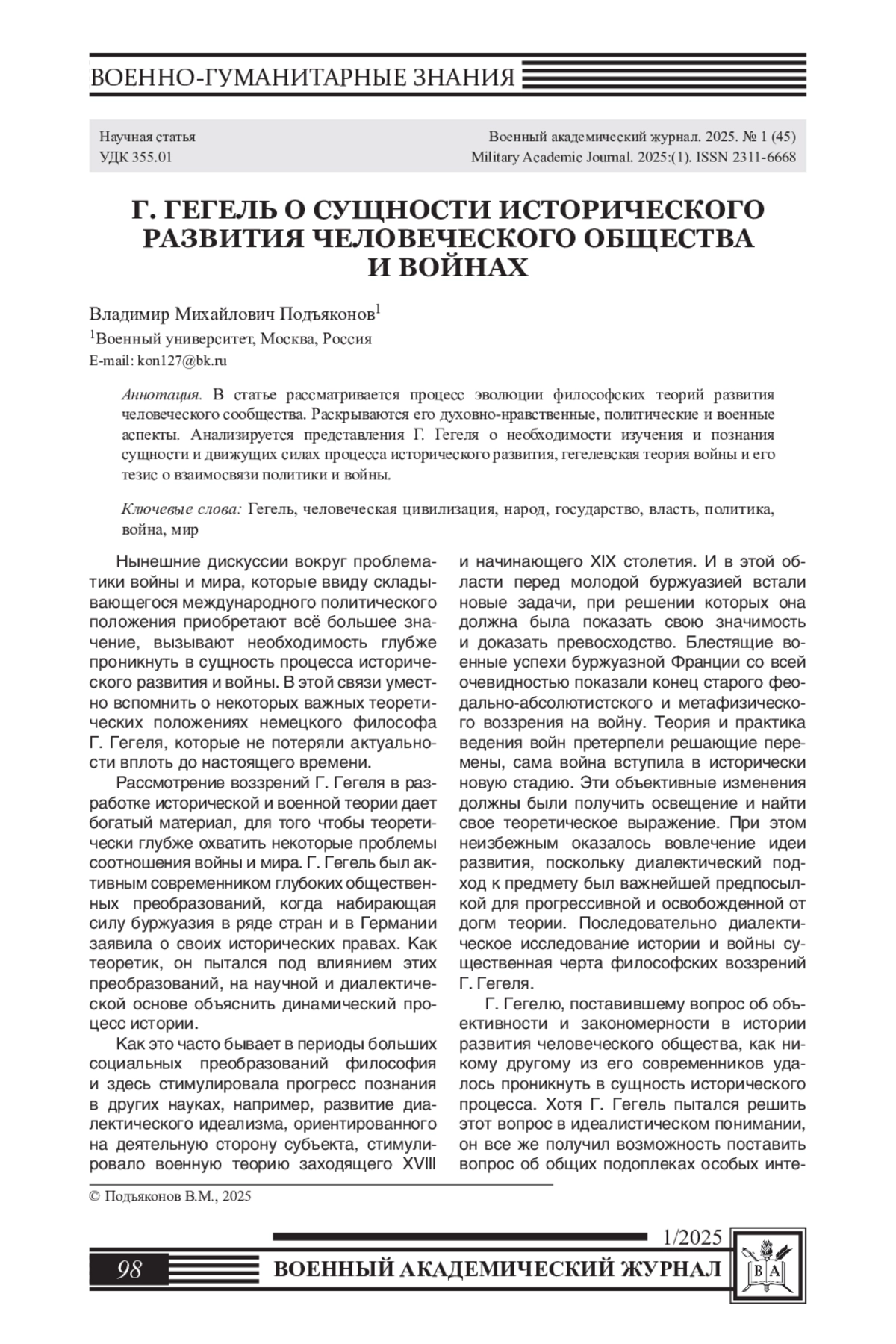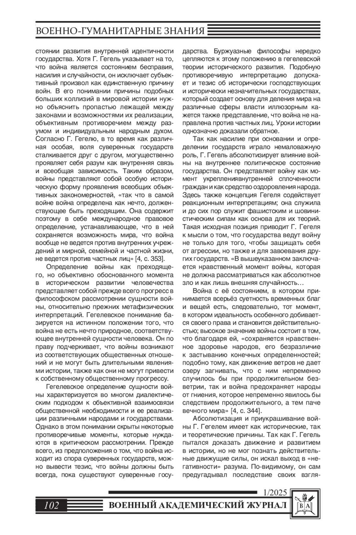 Нынешние дискуссии вокруг проблематики войны и мира, которые ввиду складывающегося международного политического положения приобретают всё большее значение, вызывают необходимость глубже проникнуть в сущность процесса исторического развития и войны. В этой связи уместно вспомнить о некоторых важных теоретических положениях немецкого философа Г. Гегеля, которые не потеряли актуальности вплоть до настоящего времени.