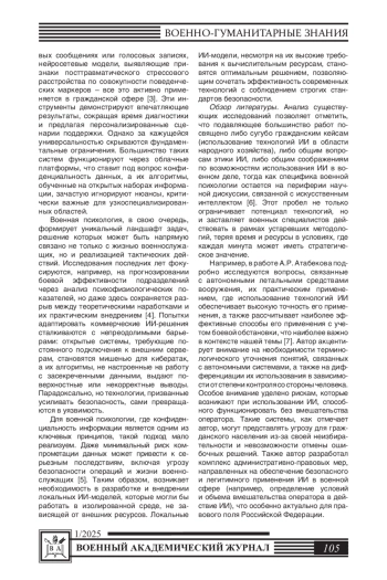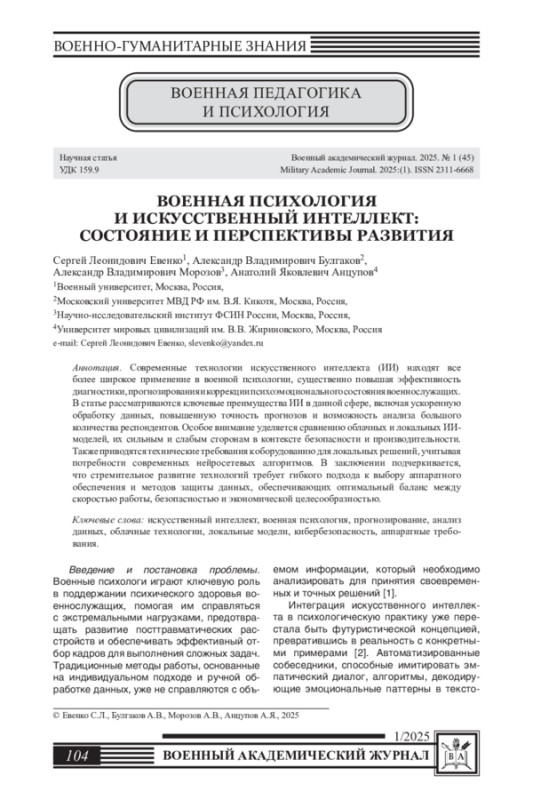 Статья посвящена исследованию использования технологий искусственного интеллекта для повышения психологической готовности военнослужащих и сотрудников Росгвардии к выполнению служебно-боевых задач. Рассматриваются возможности применения технологий искусственного интеллекта в диагностике, прогнозировании и персонализации подготовки, включая анализ биометрических данных и применение VR/AR технологий. Выявлен высокий потенциал технологий искусственного интеллекта для адаптации подготовки к индивидуальным особенностям сотрудников и современным вызовам профессиональной деятельности. Предложены рекомендации по интеграции технологий искусственного интеллекта в систему подготовки с учетом обеспечения конфиденциальности данных.