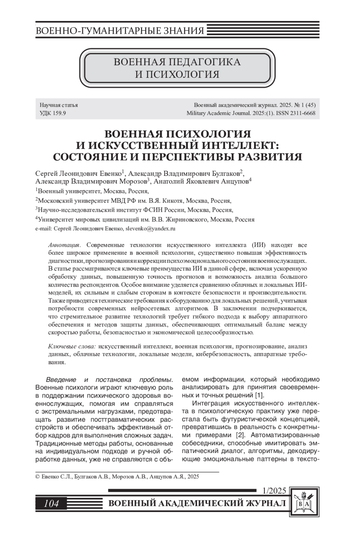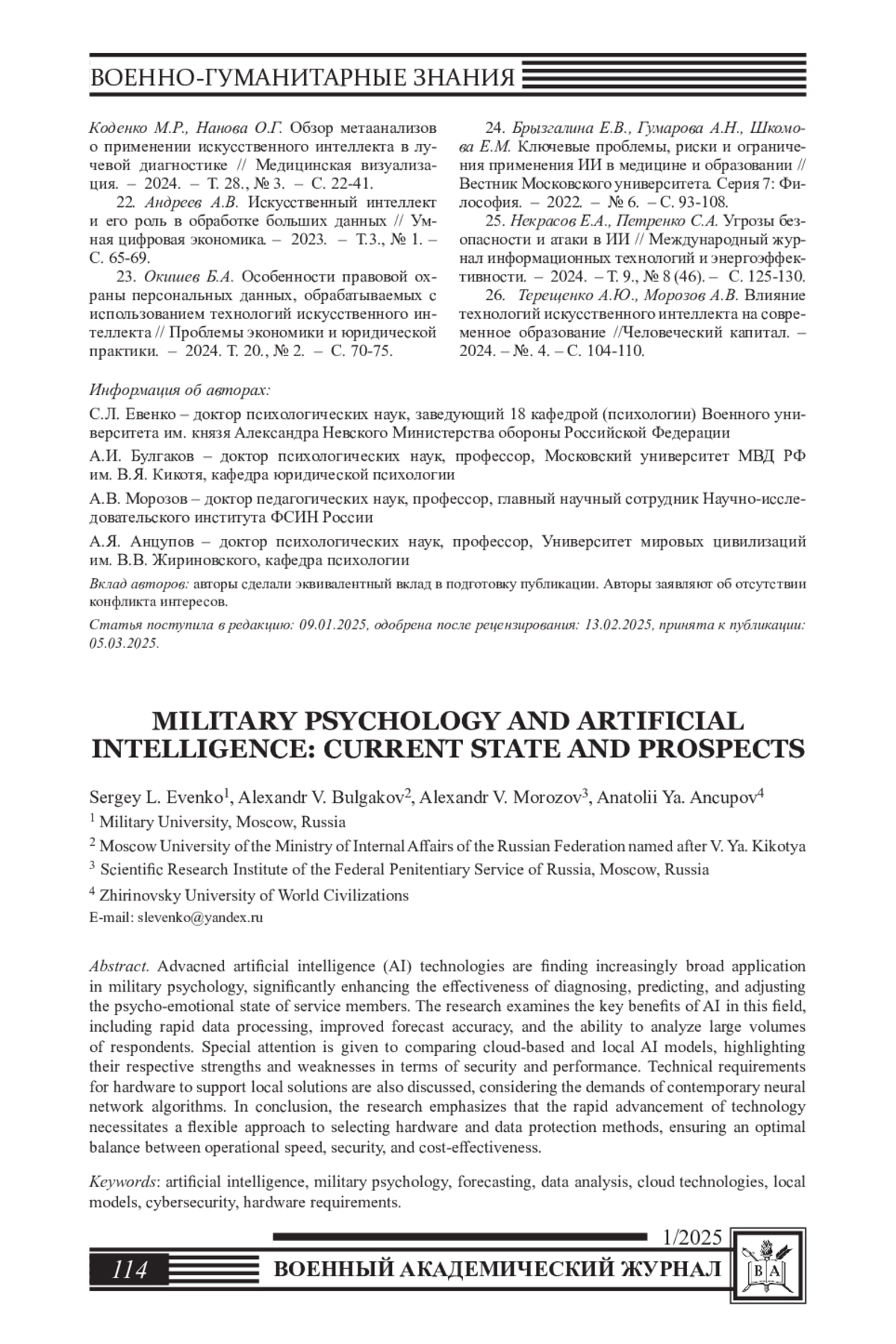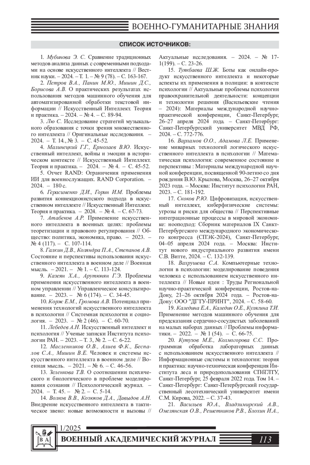 12. Масленников О.В., Алиев Ф.К., Беспалов С.А., Мишин В.Е. Человек и системы искусственного интеллекта в военном деле // Военная мысль. - 2021. - № 6. - С. 46-56. EDN: KJOTES