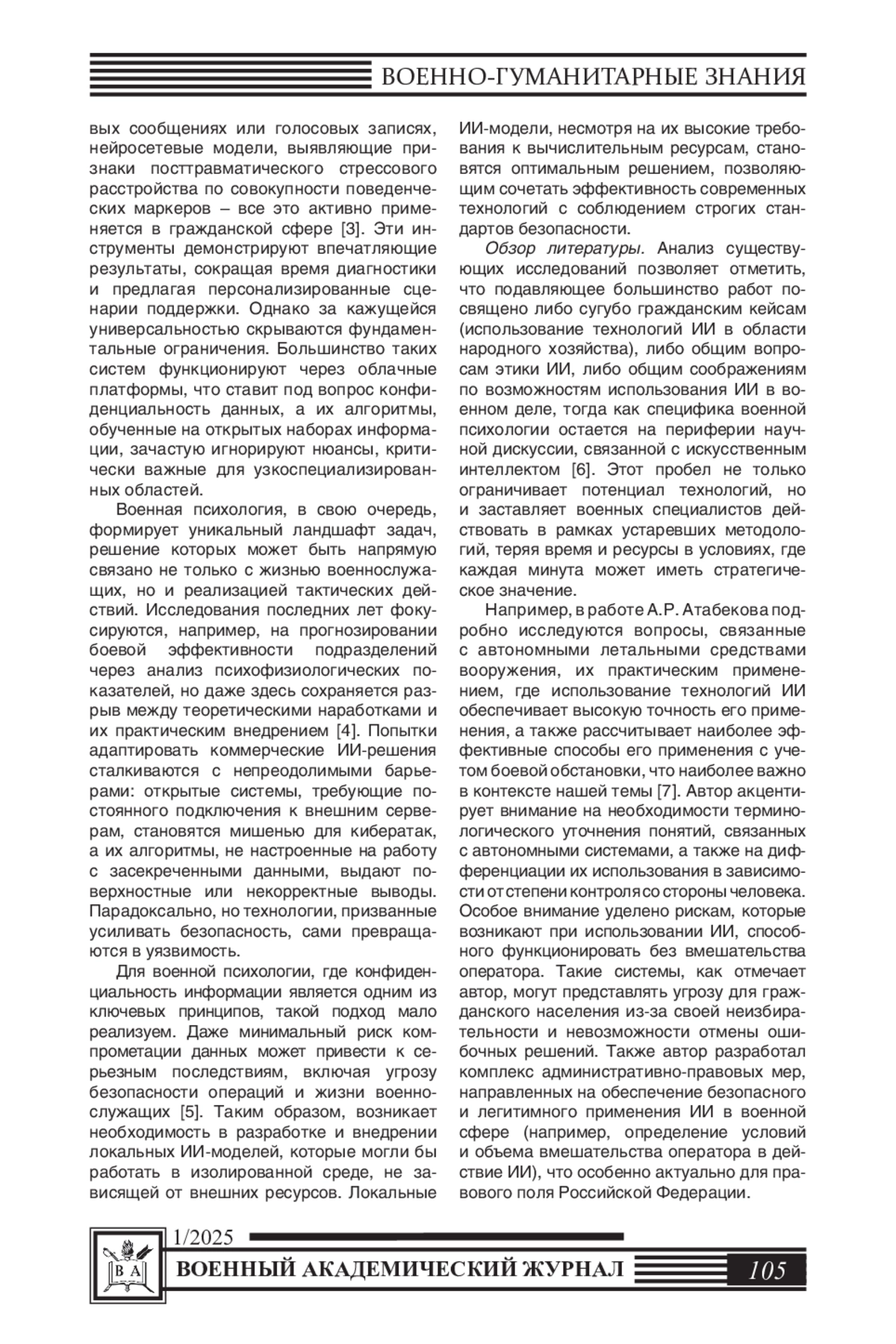 7. Атабеков А.Р. Применение искусственного интеллекта в военных целях: проблемы теоретизации и правового регулирования // Общество: политика, экономика, право. - 2023. -№ 4 (117). - С. 107-114. EDN: SPALQZ