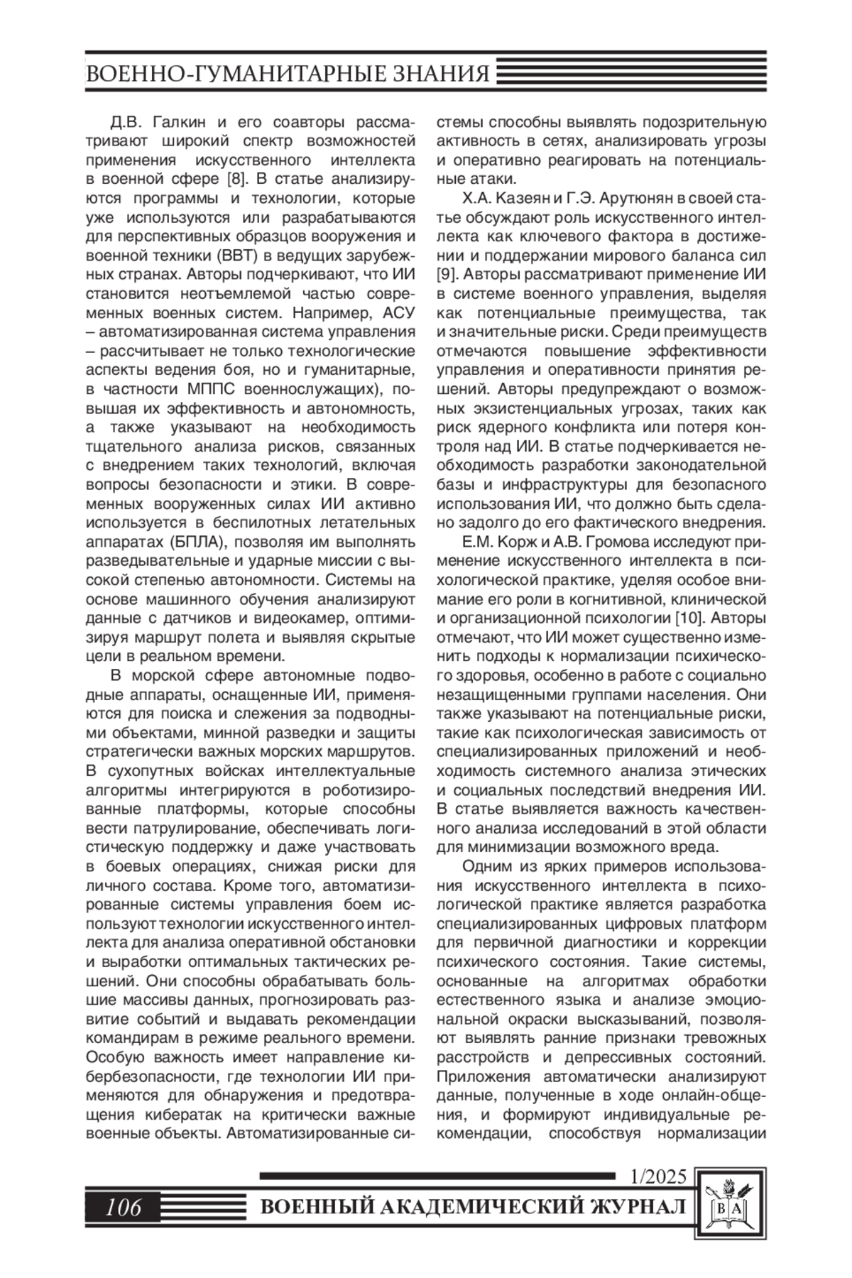 9. Казеян Х.А., Арутюнян Г.Э. Проблемы применения искусственного интеллекта в военном управлении // Управленческое консультирование. - 2023. - № 6 (174). - С. 34-45. EDN: WVVZJF