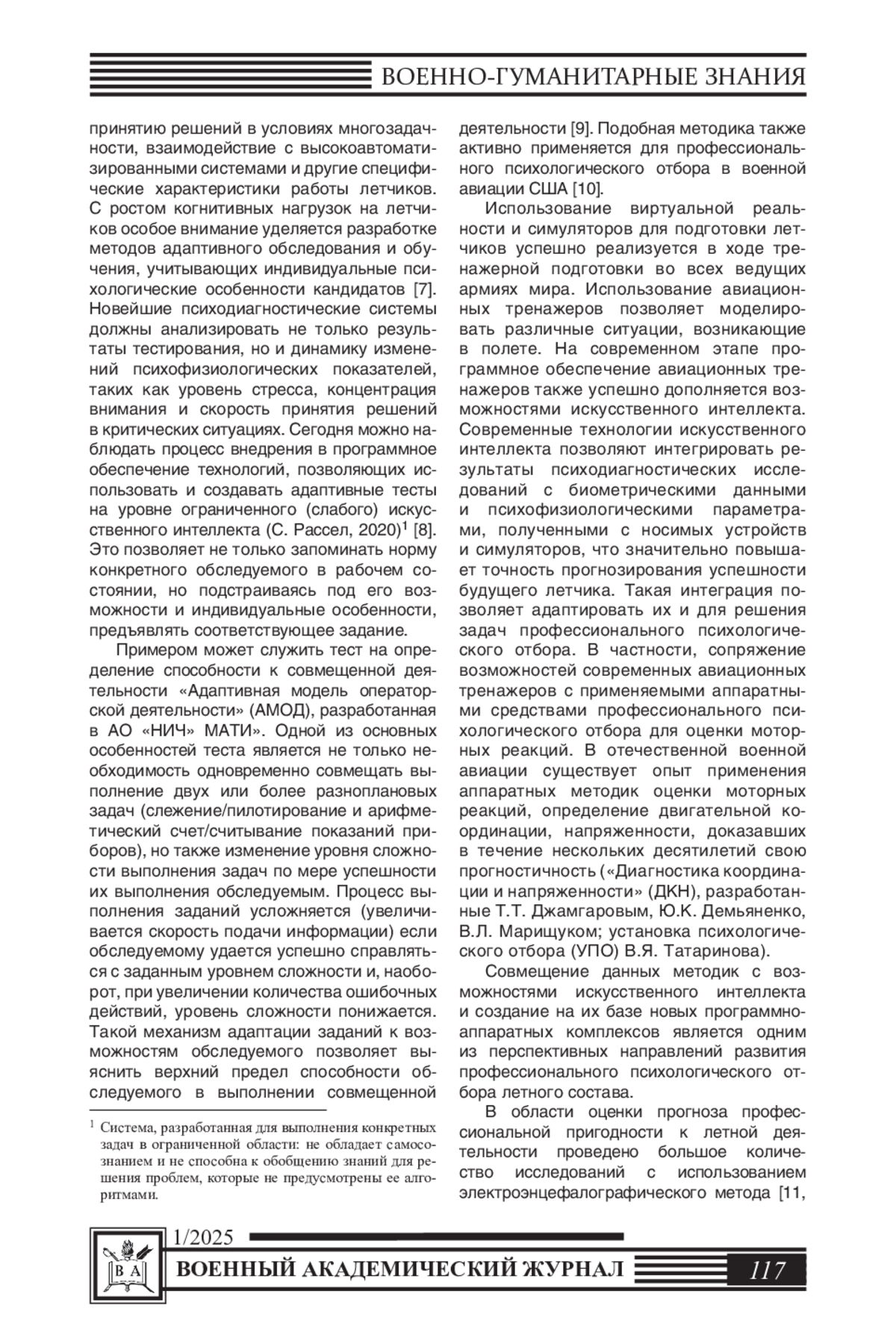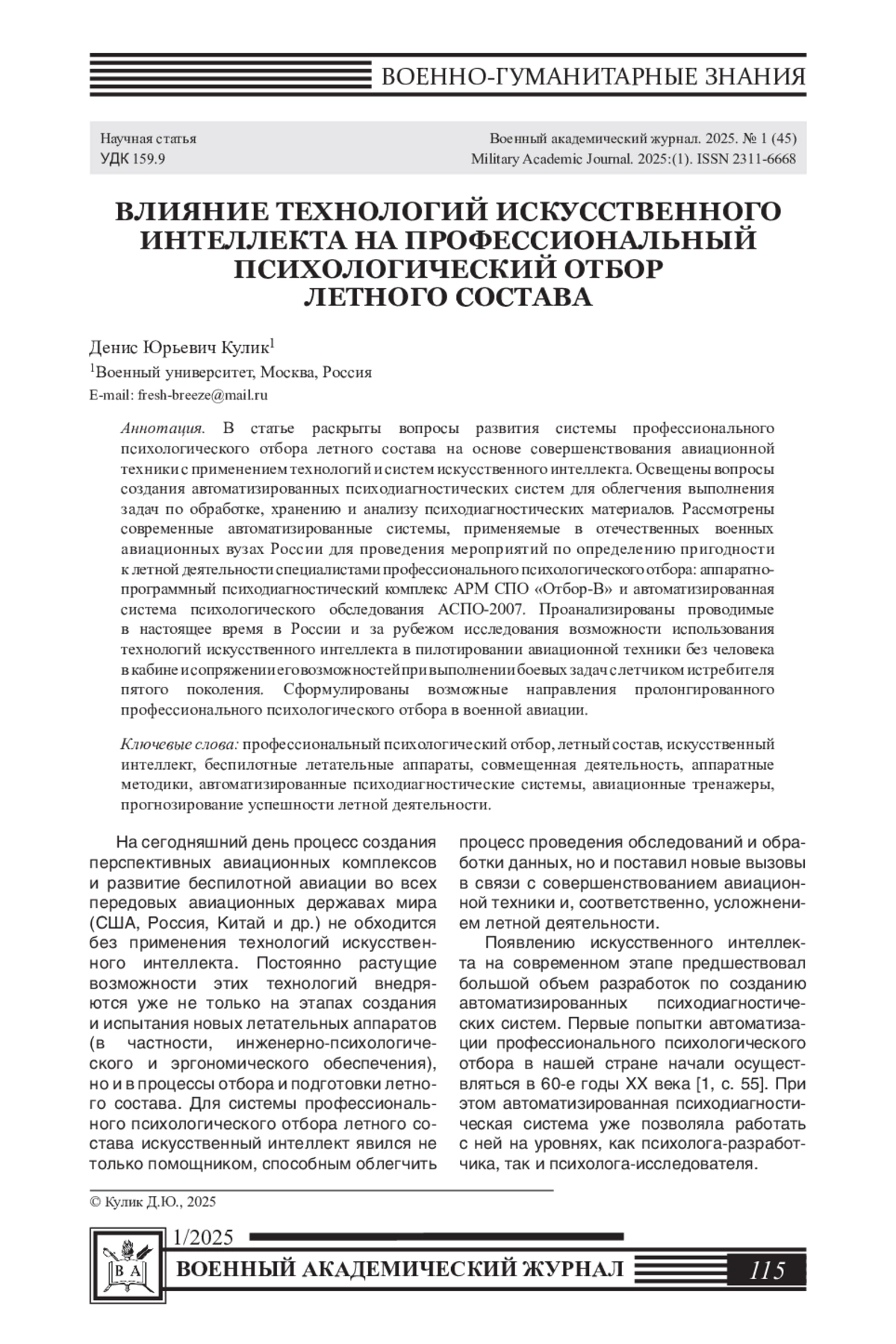 В статье раскрыты вопросы развития системы профессионального психологического отбора летного состава на основе совершенствования авиационной техники с применением технологий и систем искусственного интеллекта. Освещены вопросы создания автоматизированных психодиагностических систем для облегчения выполнения задач по обработке, хранению и анализу психодиагностических материалов. Рассмотрены современные автоматизированные системы, применяемые в отечественных военных авиационных вузах России для проведения мероприятий по определению пригодности к летной деятельности специалистами профессионального психологического отбора: аппаратнопрограммный психодиагностический комплекс АРМ СПО «Отбор-В» и автоматизированная система психологического обследования АСПО-2007. Проанализированы проводимые в настоящее время в России и за рубежом исследования возможности использования технологий искусственного интеллекта в пилотировании авиационной техники без человека в кабине и сопряжении его возможностей при выполнении боевых задач с летчиком истребителя пятого поколения. Сформулированы возможные направления пролонгированного профессионального психологического отбора в военной авиации.