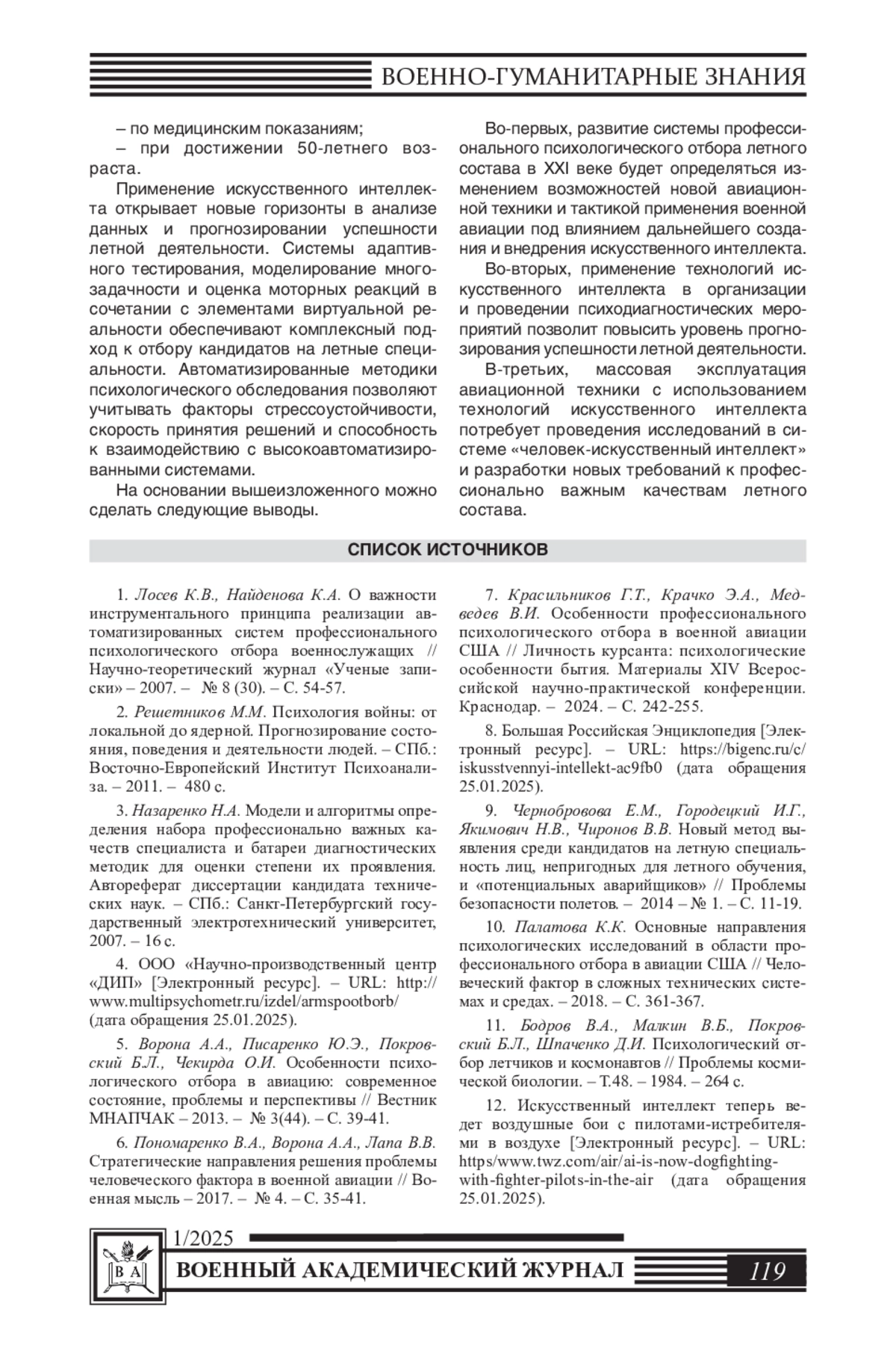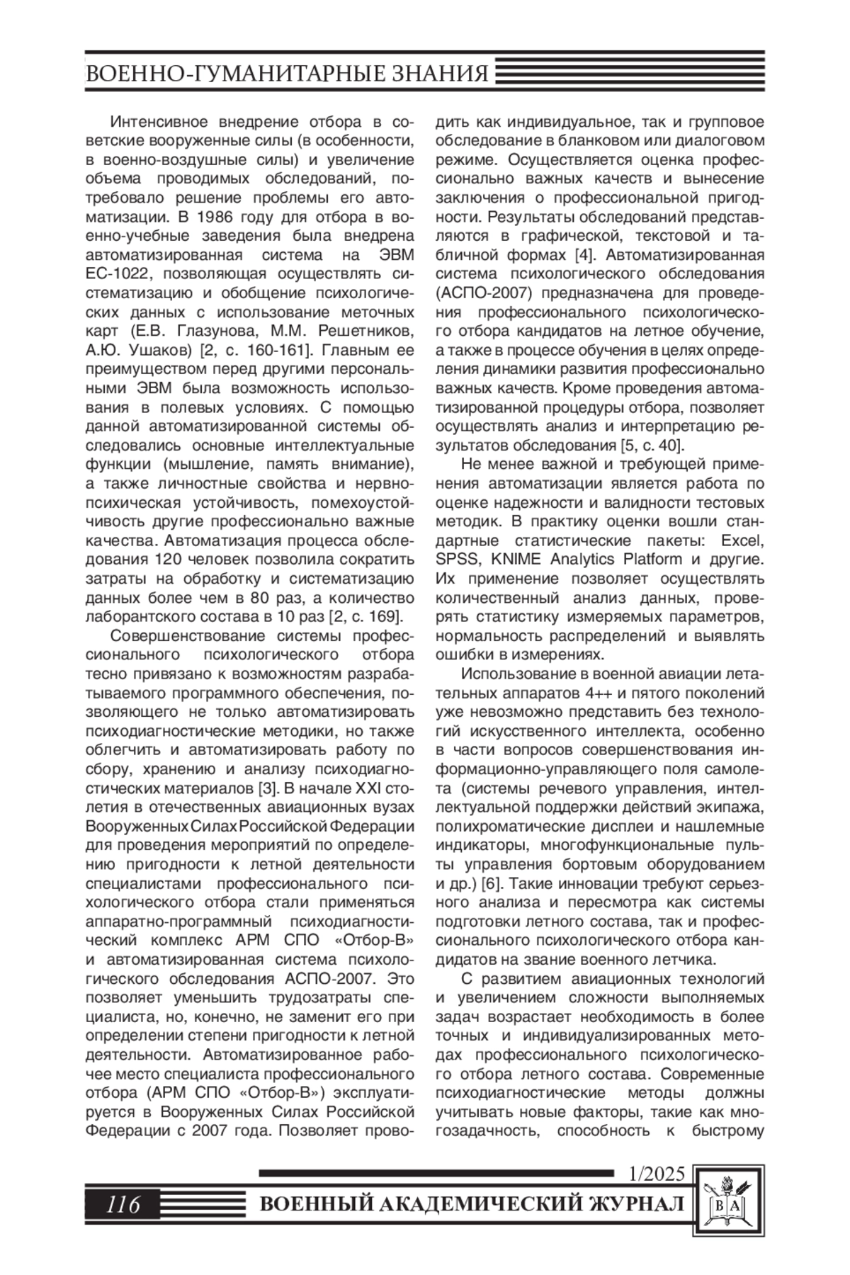 7. Красильников Г.Т., Крачко Э.А., Медведев В.И. Особенности профессионального психологического отбора в военной авиации США // Личность курсанта: психологические особенности бытия. Материалы XIV Всероссийской научно-практической конференции. Краснодар. - 2024. - С. 242-255.