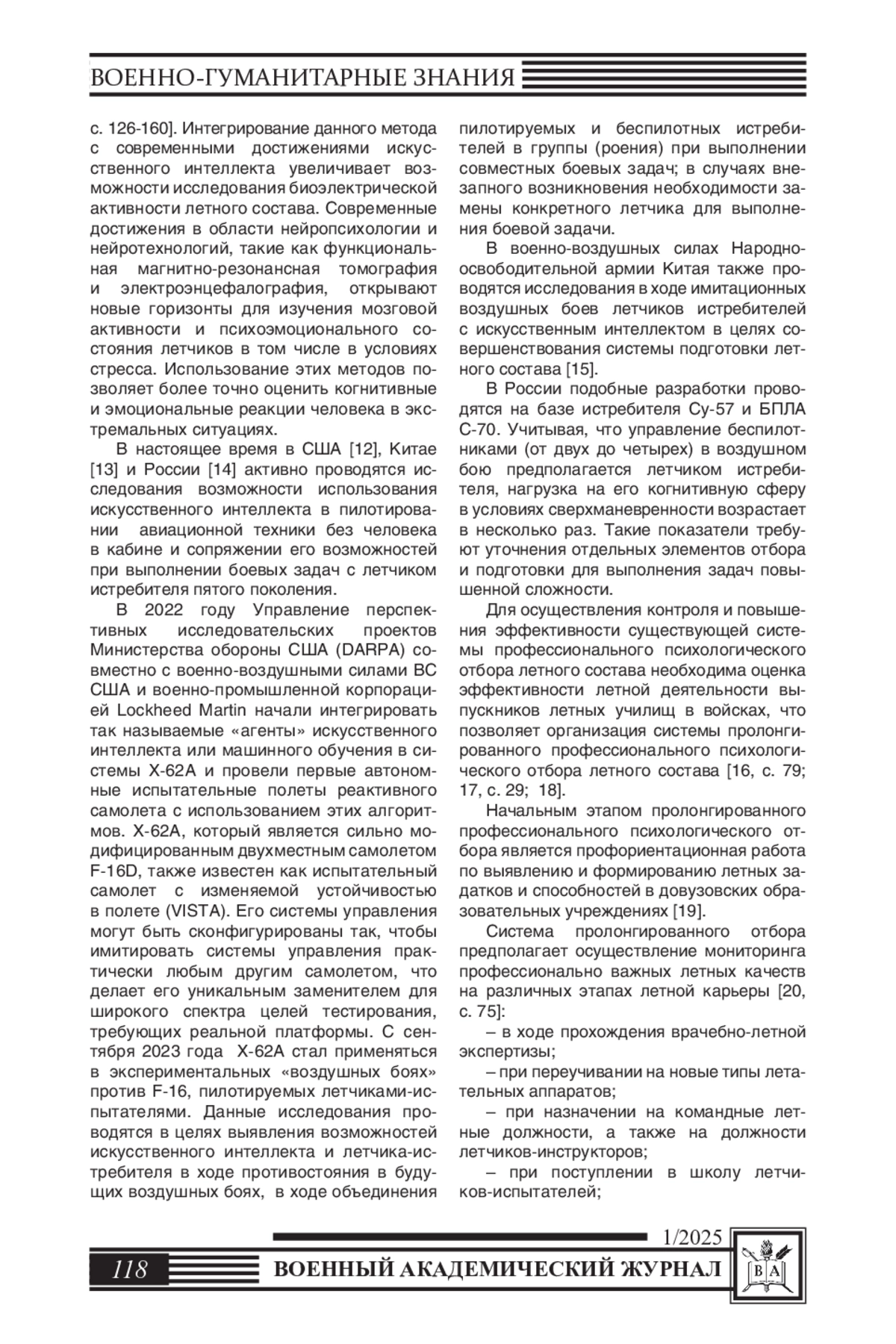 15. “Вскоре пилоты не смогут справиться без помощи искусственного интеллекта”: в Китае прошла имитация “воздушных боев” [Электронный ресурс]. - URL: https://topwar.ru/184066-vskore-piloty-ne-smogut-spravitsja-bez-pomoschi-ii-v-kitae-proshli-vozdushnye- boi-asov-s-kompjuterami.html?ysclid= m6y5vehvz 0410815143 (дата обращения 25.01.2025).