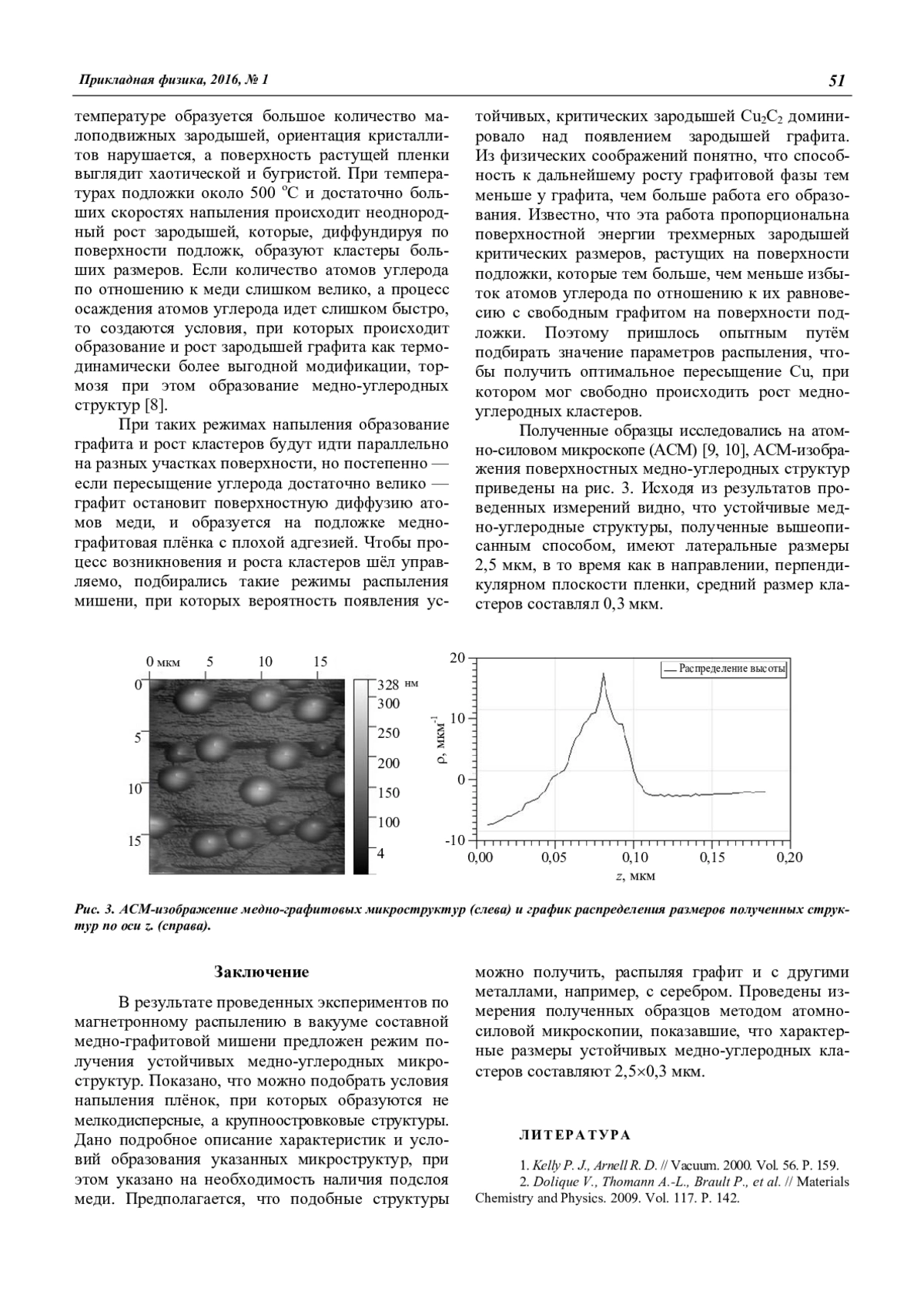 В результате проведенных экспериментов по магнетронному распылению в вакууме составной медно-графитовой мишени предложен режим получения устойчивых медно-углеродных микроструктур. Показано, что можно подобрать условия напыления плёнок, при которых образуются не мелкодисперсные, а крупноостровковые структуры. Дано подробное описание характеристик и условий образования указанных микроструктур, при этом указано на необходимость наличия подслоя меди. Предполагается, что подобные структуры можно получить, распыляя графит и с другими металлами, например, с серебром. Проведены измерения полученных образцов методом атомносиловой микроскопии, показавшие, что характерные размеры устойчивых медно-углеродных кластеров составляют 2,50,3 мкм.