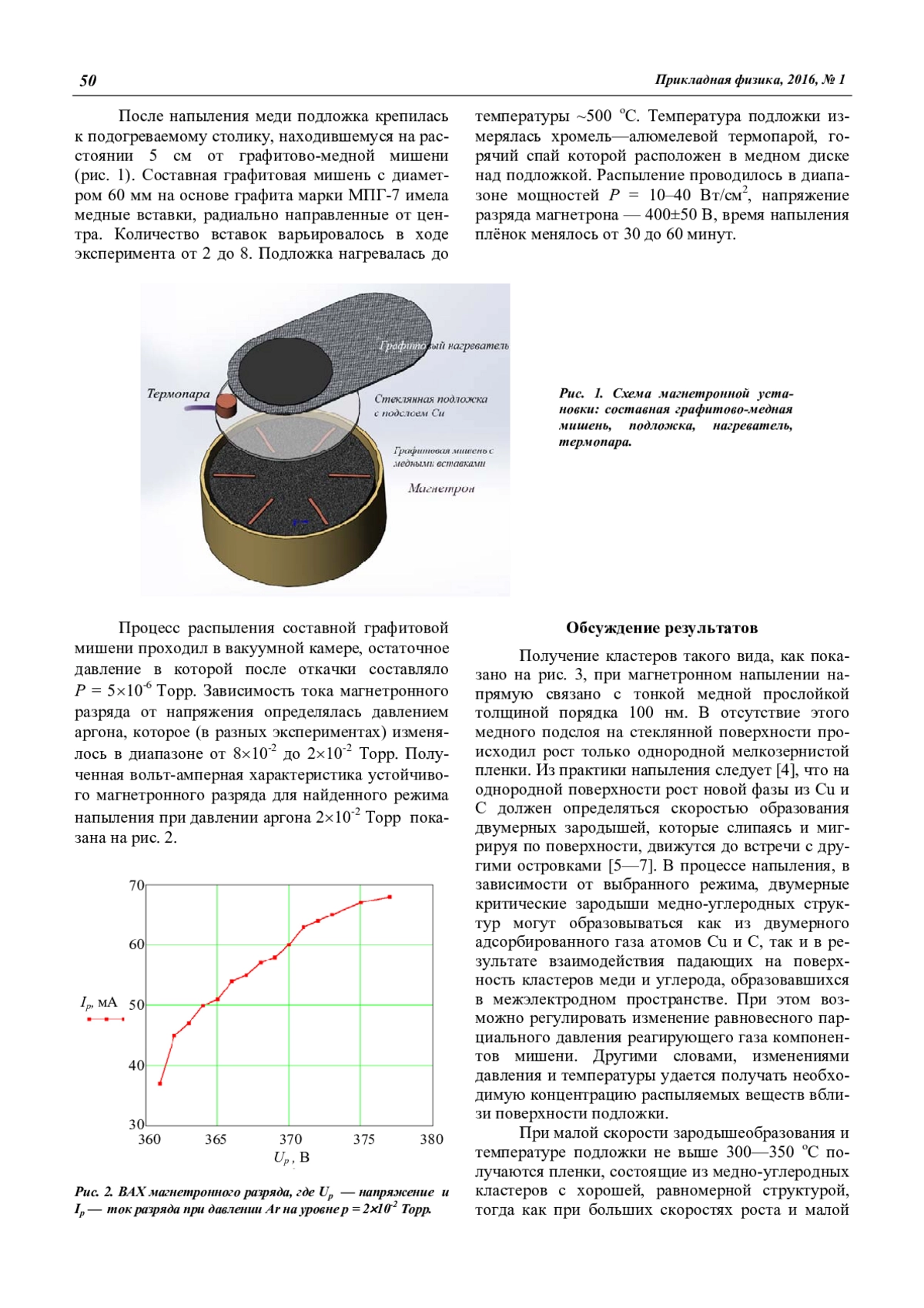 Валянский С. И., Виноградов С. В., Кононов М. А., Кононов В. М., Растопов С. Ф. Образование поверхностных медно-углеродных микроструктур при распылении составной графитово-медной мишени магнетронным способом 49