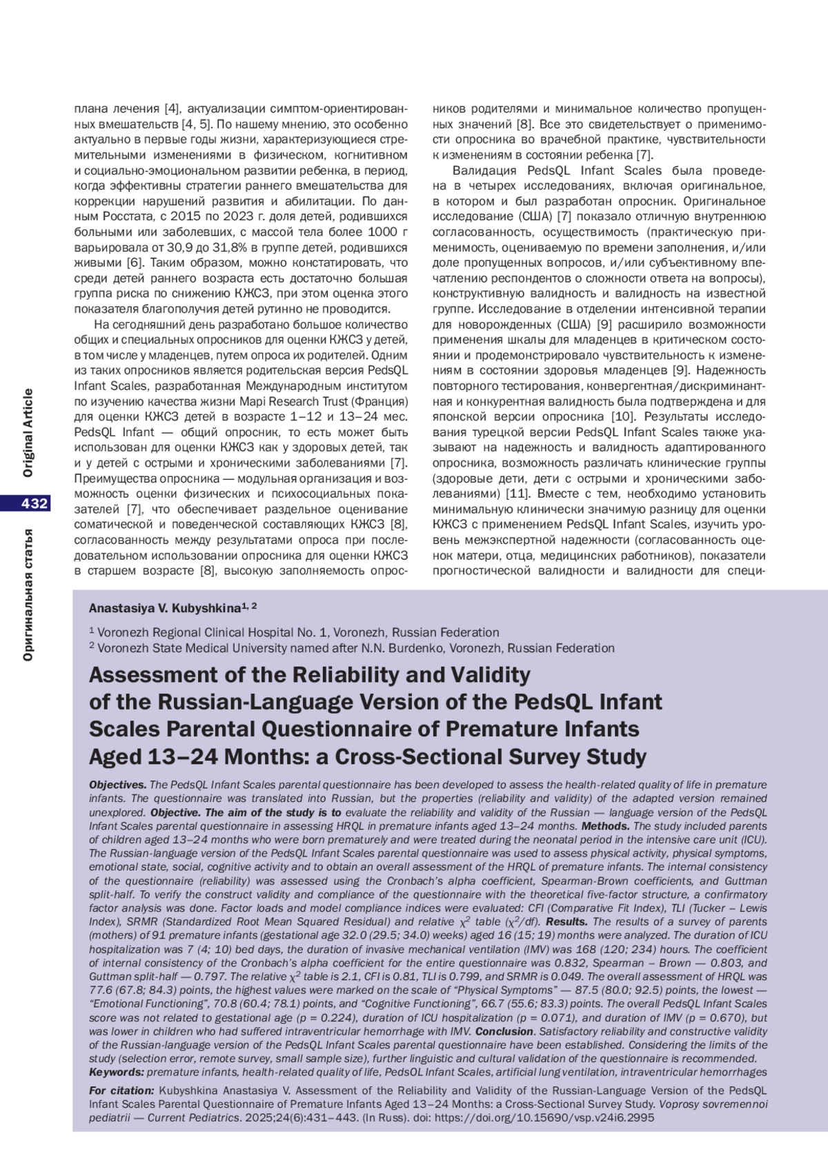 КУБЫШКИНА А. В. ОЦЕНКА НАДЕЖНОСТИ И ВАЛИДНОСТИ РУССКОЯЗЫЧНОЙ ВЕРСИИ ОПРОСНИКА PEDSQL INFANT SCALES ДЛЯ РОДИТЕЛЕЙ НЕДОНОШЕННЫХ ДЕТЕЙ В ВОЗРАСТЕ 13–24 МЕСЯЦЕВ: ОДНОМОМЕНТНОЕ ОПРОСНОЕ ИССЛЕДОВАНИЕ // ВОПРОСЫ СОВРЕМЕННОЙ ПЕДИАТРИИ. 2025. № 6, ТОМ 24