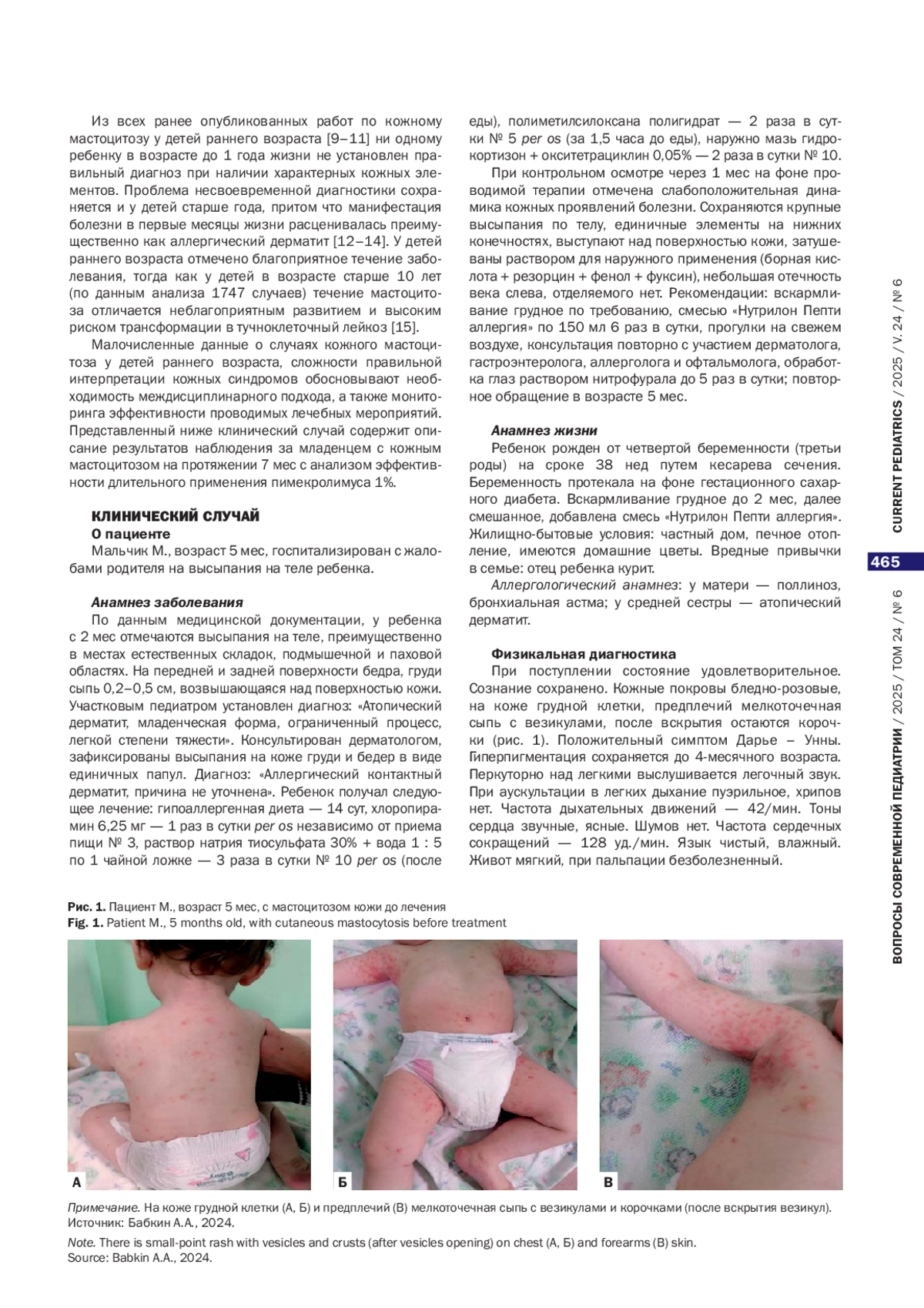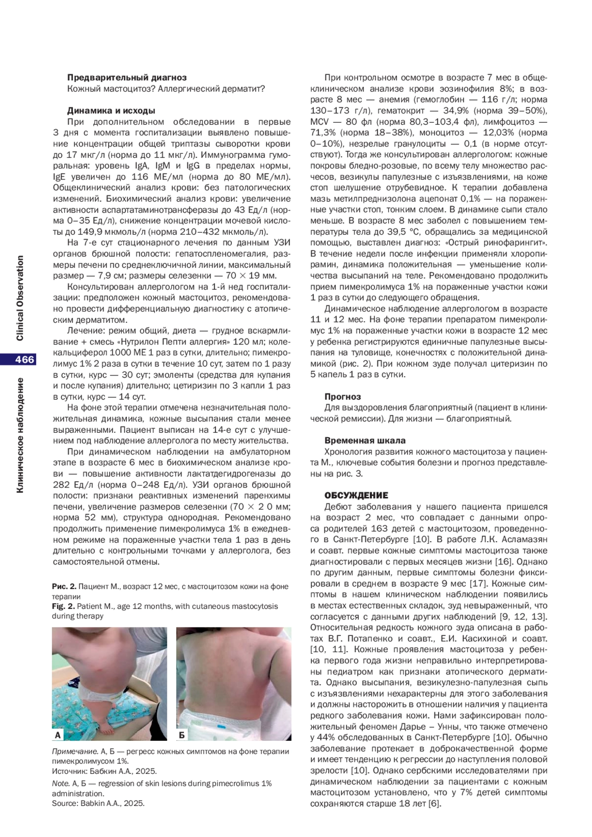 Обоснование. Кожный мастоцитоз у детей является редким заболеванием с благоприятным исходом в большинстве случаев, однако в возрасте старше 10 лет течение заболевания может осложниться трансформацией в тучноклеточный лейкоз. У детей раннего возраста возможны сложности в интерпретации кожных синдромов заболевания. Описание клинического случая. Описан случай распространенного кожного мастоцитоза у ребенка раннего возраста с регрессом клинической картины к 11 мес. Заболевание дебютировало в 2 мес, когда на теле в местах естественных складок появились высыпания. У пациента при клиническом осмотре диагностирован симптом Дарье – Унны. При лабораторном обследовании зафиксировано увеличение концентрации общей триптазы сыворотки до 17 мкг/л, общего IgE — до 116 МЕ/мл. На фоне терапии антигистаминным препаратом второго поколения в возрастной дозировке и применения пимекролимуса 1% в течение 11 мес зарегистрирована положительная динамика — купирование кожного синдрома, уменьшение выраженности элементов кожной сыпи. Заключение. У детей раннего возраста с признаками аллергического заболевания при слабоположительной динамике кожного процесса на фоне терапии необходимо проводить дифференциальную диагностику с кожной формой мастоцитоза.