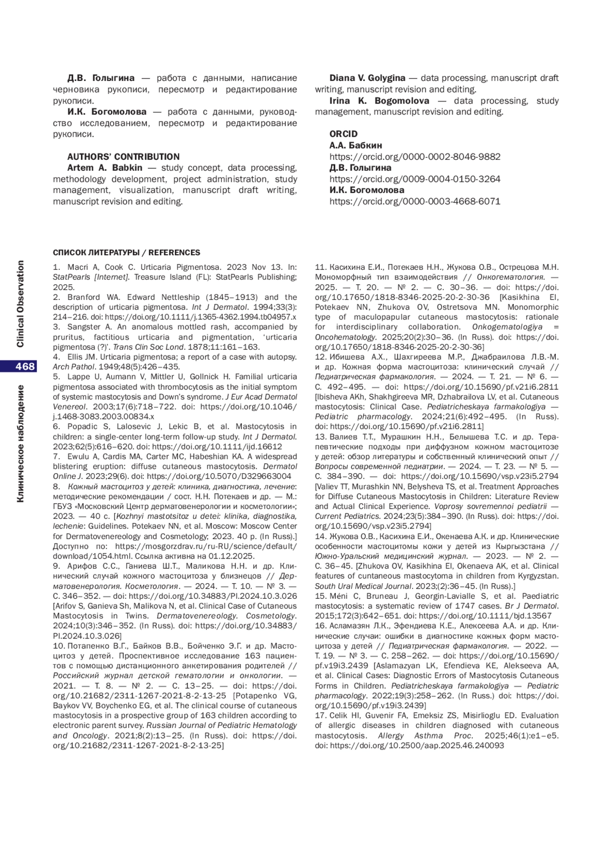 8. Кожный мастоцитоз у детей: клиника, диагностика, лечение: методические рекомендации / сост. Н.Н. Потекаев и др. - М.: ГБУЗ «Московский Центр дерматовенерологии и косметологии»; 2023. - 40 с. Доступно по: https://mosgorzdrav.ru/ru-RU/science/default/download/1054.html. Ссылка активна на 01.12.2025.