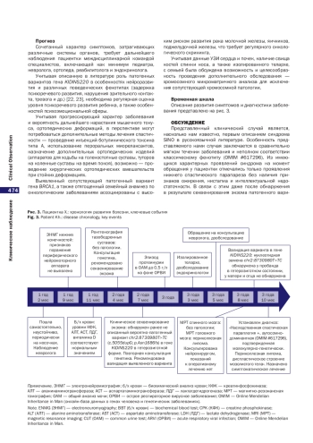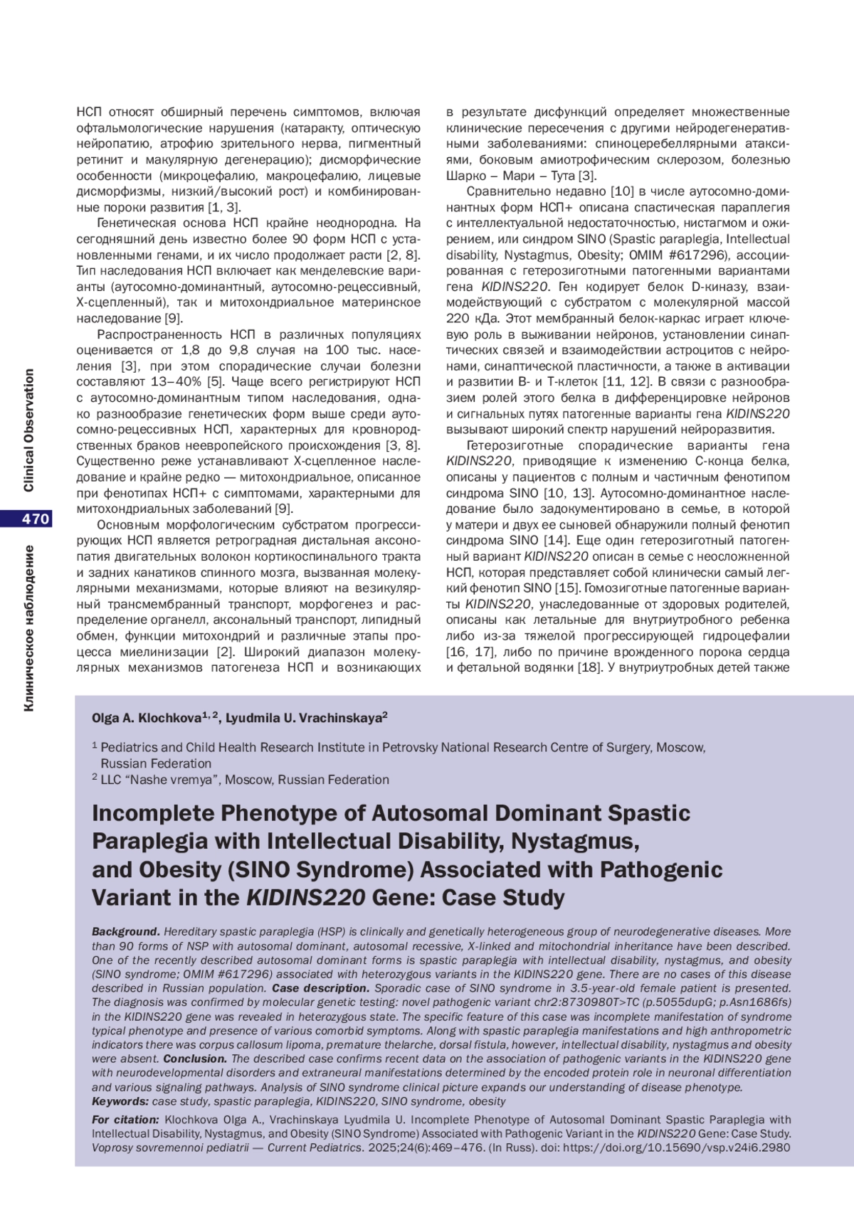 Обоснование. Наследственные спастические параплегии (НСП) - это клинически и генетически гетерогенная группа нейродегенеративных заболеваний. Описано более 90 форм НСП с аутосомно-доминантным, аутосомнорецессивным, Х-сцепленным и митохондриальным типами наследования. В числе аутосомно-доминантных вариантов НСП недавно описана спастическая параплегия с интеллектуальной недостаточностью, нистагмом и ожирением (SINO; OMIM #617296), ассоциированная с гетерозиготными патогенными вариантами гена KIDINS220. В российской популяции случаи болезни ранее не описаны. Описание клинического случая. Представлен анализ спорадического случая синдрома SINO у пациентки 3,5 лет. Диагноз подтвержден молекулярно-генетически, обнаружен ранее не описанный патогенный вариант chr2:8730980T>TC (с.5055dupG; p. Asn1686fs) гена KIDINS220 в гетерозиготной форме. Особенностью случая является неполное проявление типичного фенотипа синдрома и наличие разнообразных сопутствующих симптомов. Наряду с признаками спастической параплегии и высокими антропометрическими показателями наблюдались липома мозолистого тела, преждевременное телархе, свищ костей спинки носа, однако интеллектуальная недостаточность, нистагм и ожирение отсутствовали. Заключение. Описанный случай подтверждает последние данные о связи патогенных вариантов гена KIDINS220 со спектром нарушений нейроразвития и экстраневральных проявлений, обусловленных ролью кодируемого белка в дифференцировке нейронов и различных сигнальных путях. Анализ клинической картины синдрома SINO расширяет наши представления о фенотипе заболевания.