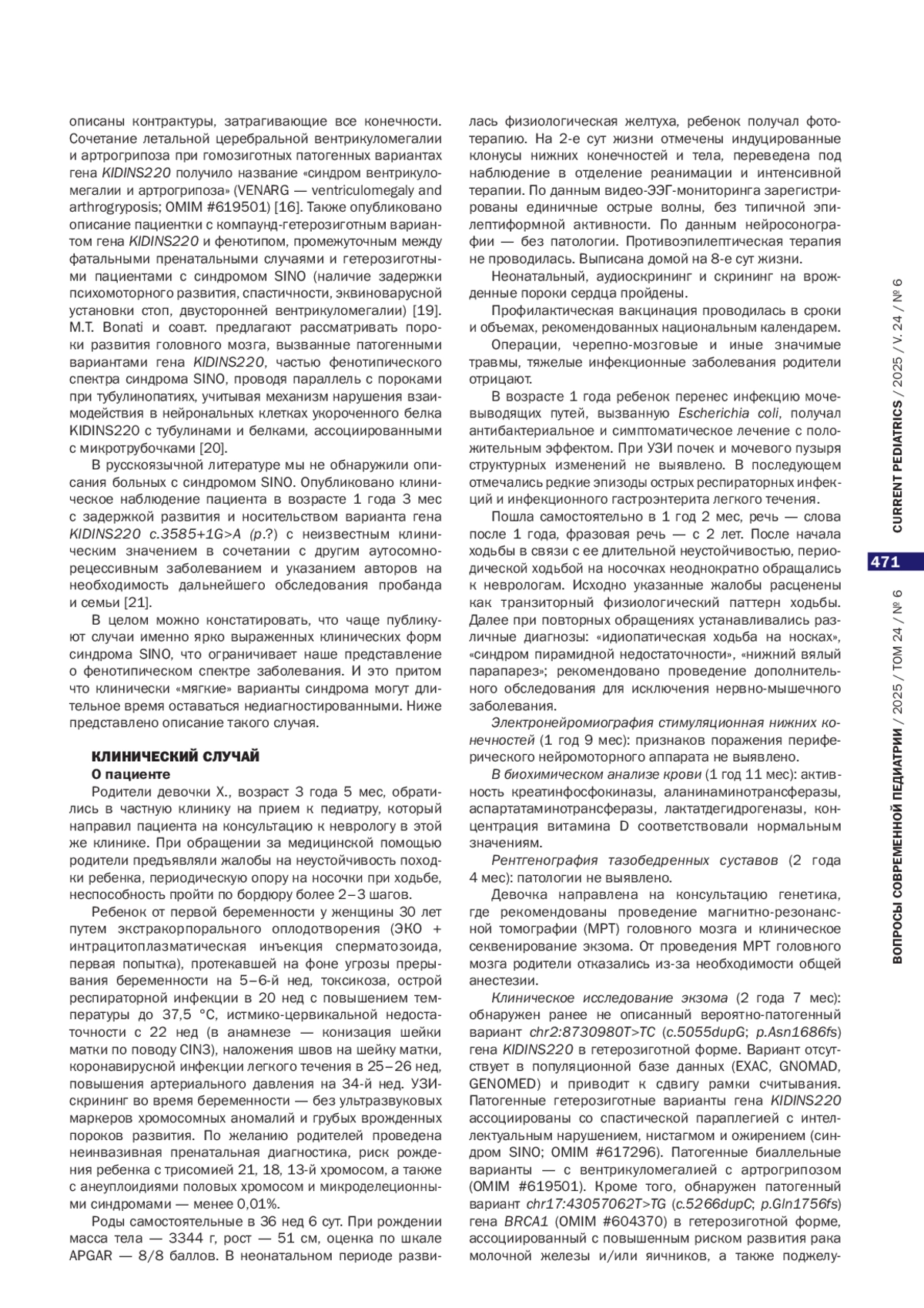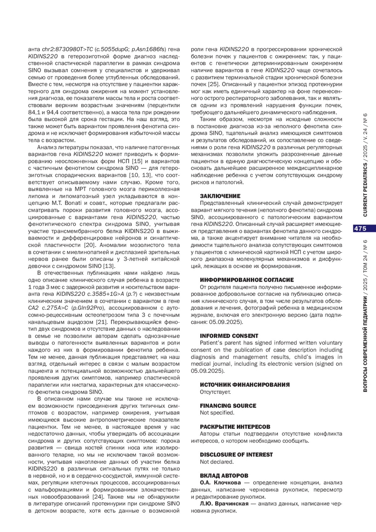 21. Сизякова О.М., Сенина О.С., Усова Д.В. и др. Коморбидность аутосомно-рецессивных заболеваний с задержкой развития: клиническое наблюдение // Медицинская генетика. - 2025. - Т. 24. - № 8. - С. 117-119. - doi: https://doi.org/10.25557/2073-7998.2025.08.117-119.