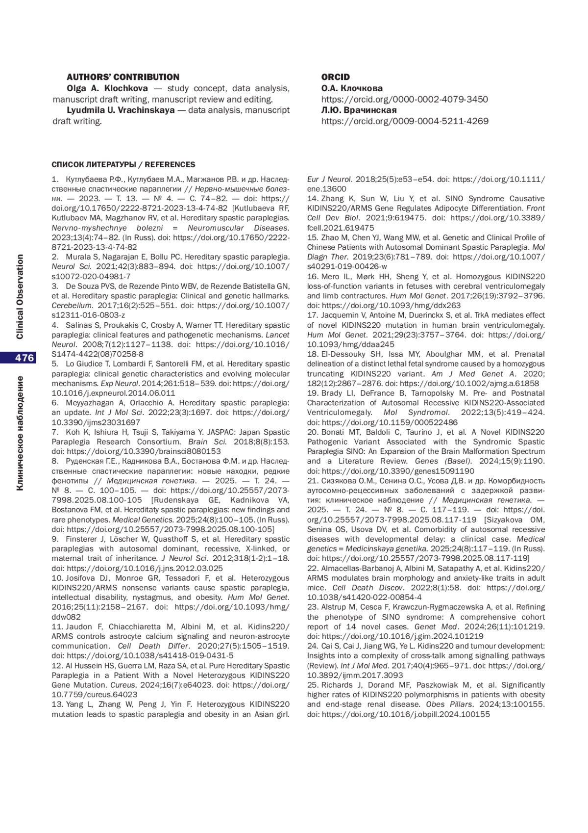 8. Руденская Г.Е., Кадникова В.А., Бостанова Ф.М. и др. Наследственные спастические параплегии: новые находки, редкие фенотипы // Медицинская генетика. - 2025. - Т. 24. - № 8. - С. 100-105. - doi: https://doi.org/10.25557/2073-7998.2025.08.100-105.