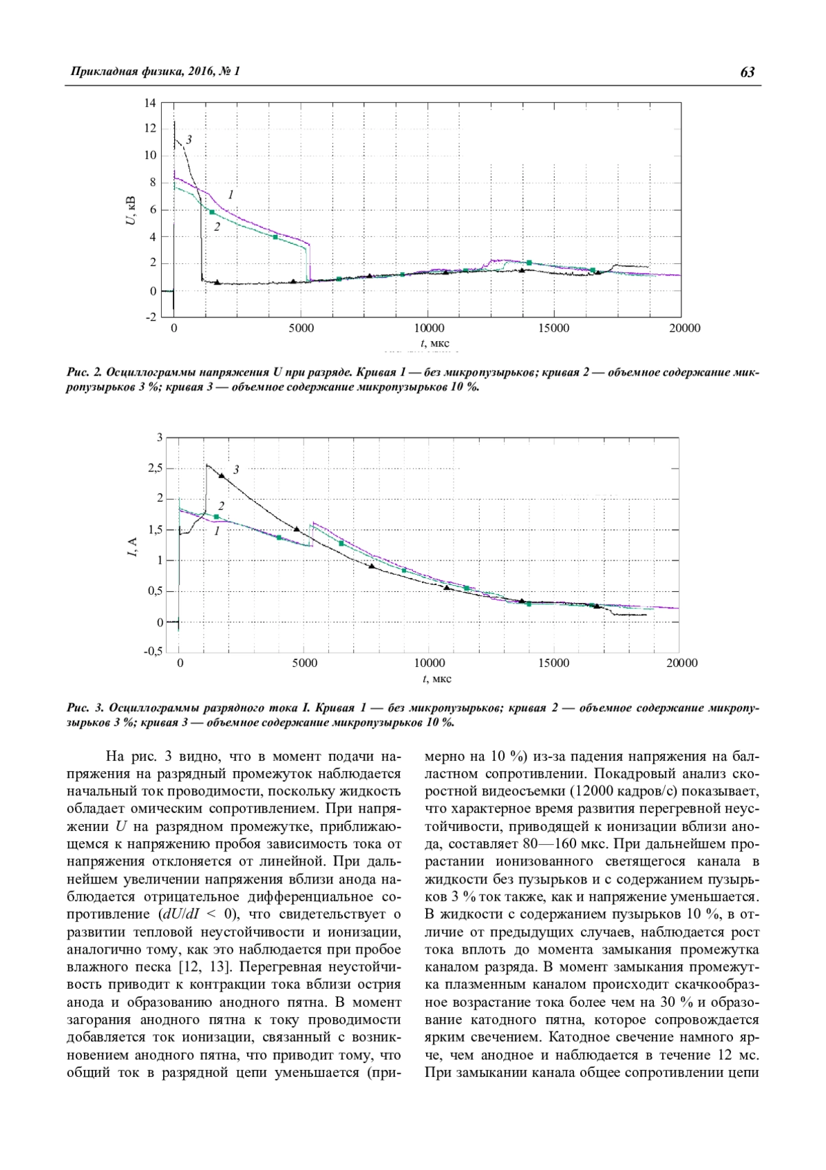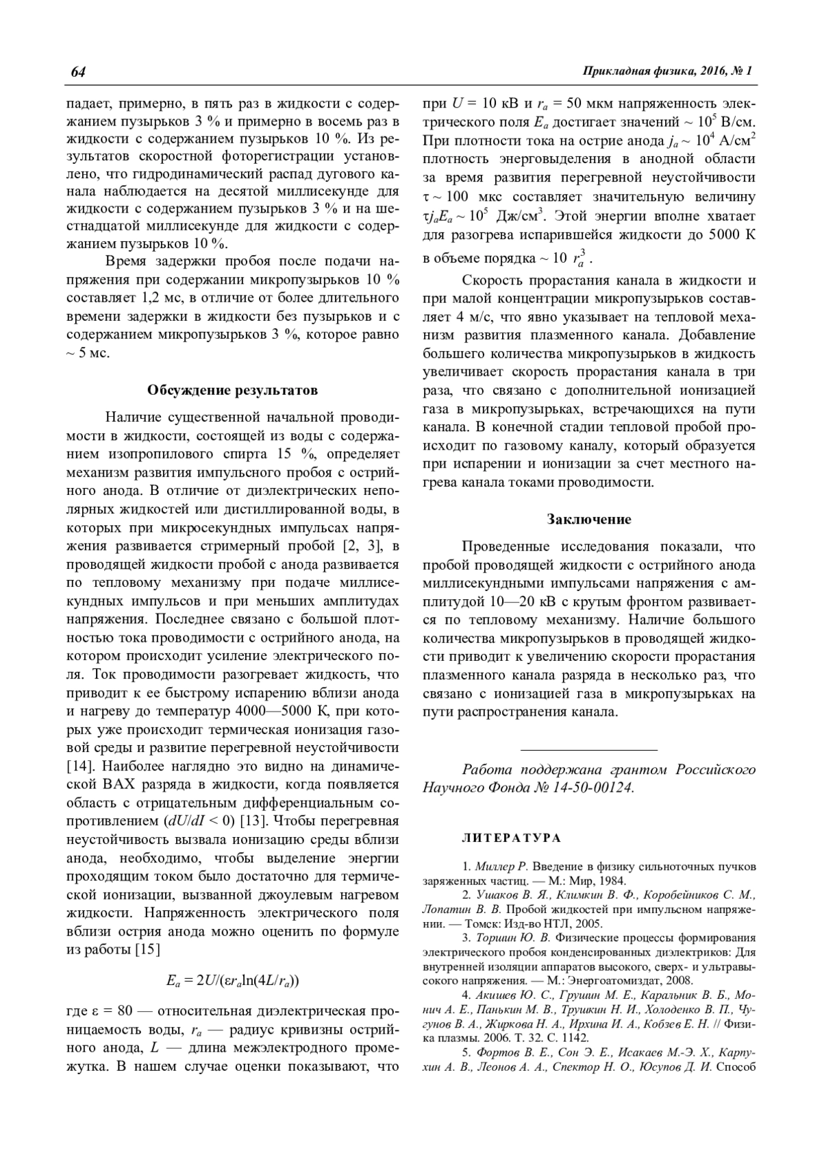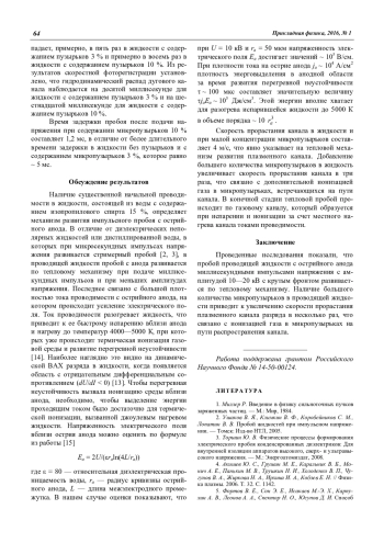 Проведенные исследования показали, что пробой проводящей жидкости с острийного анода миллисекундными импульсами напряжения с амплитудой 10—20 кВ с крутым фронтом развивается по тепловому механизму. Наличие большого количества микропузырьков в проводящей жидкости приводит к увеличению скорости прорастания плазменного канала разряда в несколько раз, что связано с ионизацией газа в микропузырьках на пути распространения канала.