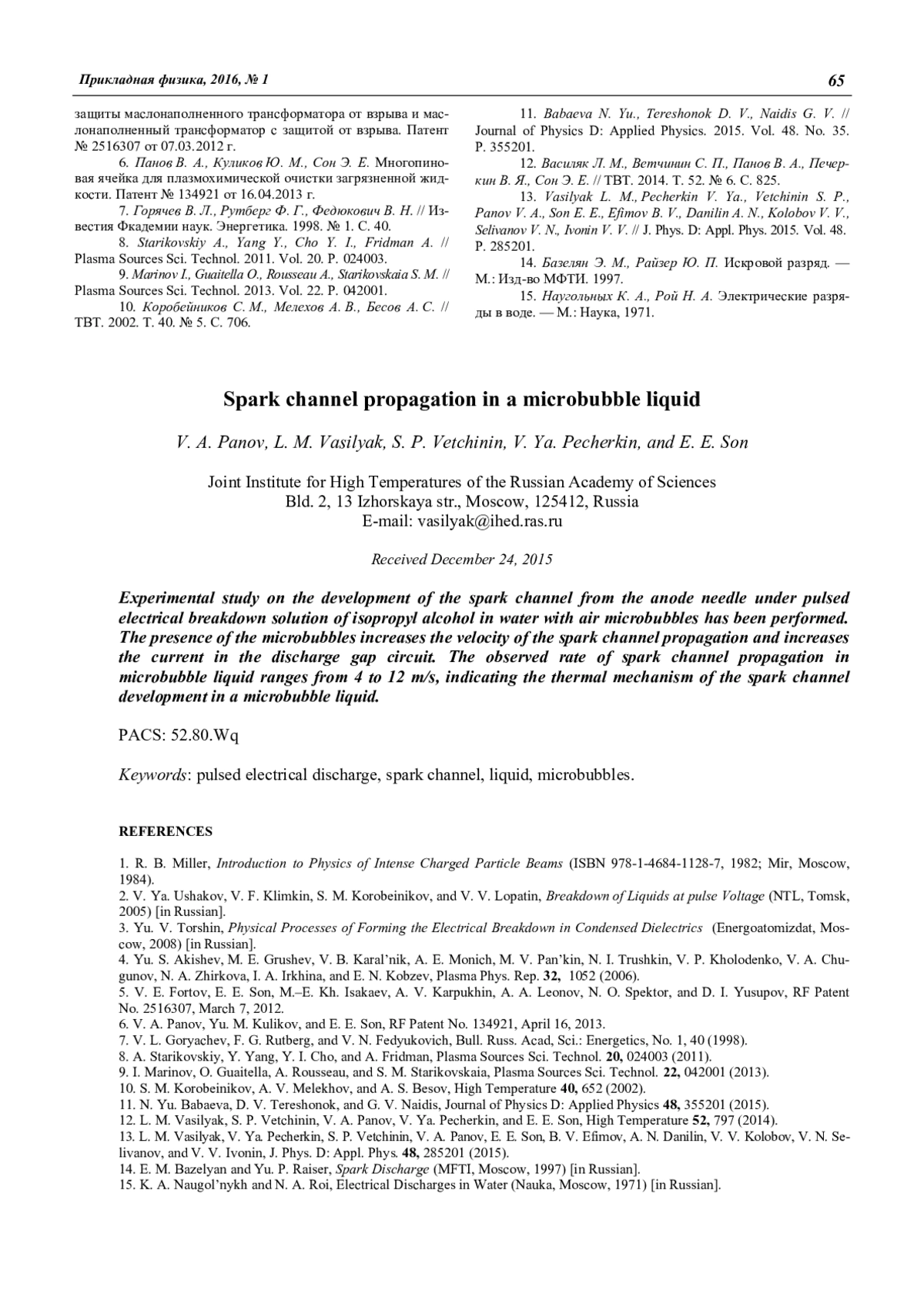 13. Vasilyak L. M., Pecherkin V. Ya., Vetchinin S. P., Panov V. A., Son E. E., Efimov B. V., Danilin A. N., Kolobov V. V., Selivanov V. N., Ivonin V. V. // J. Phys. D: Appl. Phys. 2015. Vol. 48. P. 285201.