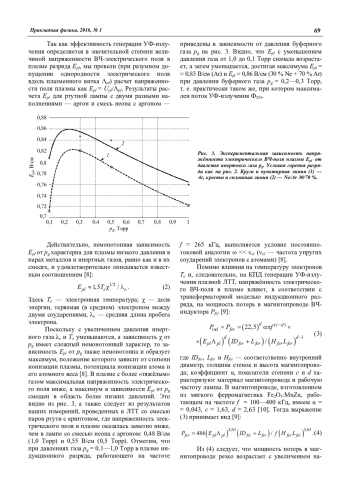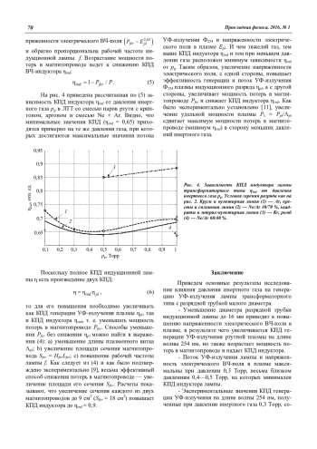 - Поток УФ-излучения лампы и напряженность электрического ВЧ-поля в плазме максимальны при давлении 0,3 Торр, весьма близком давлениям 0,4—0,5 Торр, на которых минимален КПД индуктора лампы.