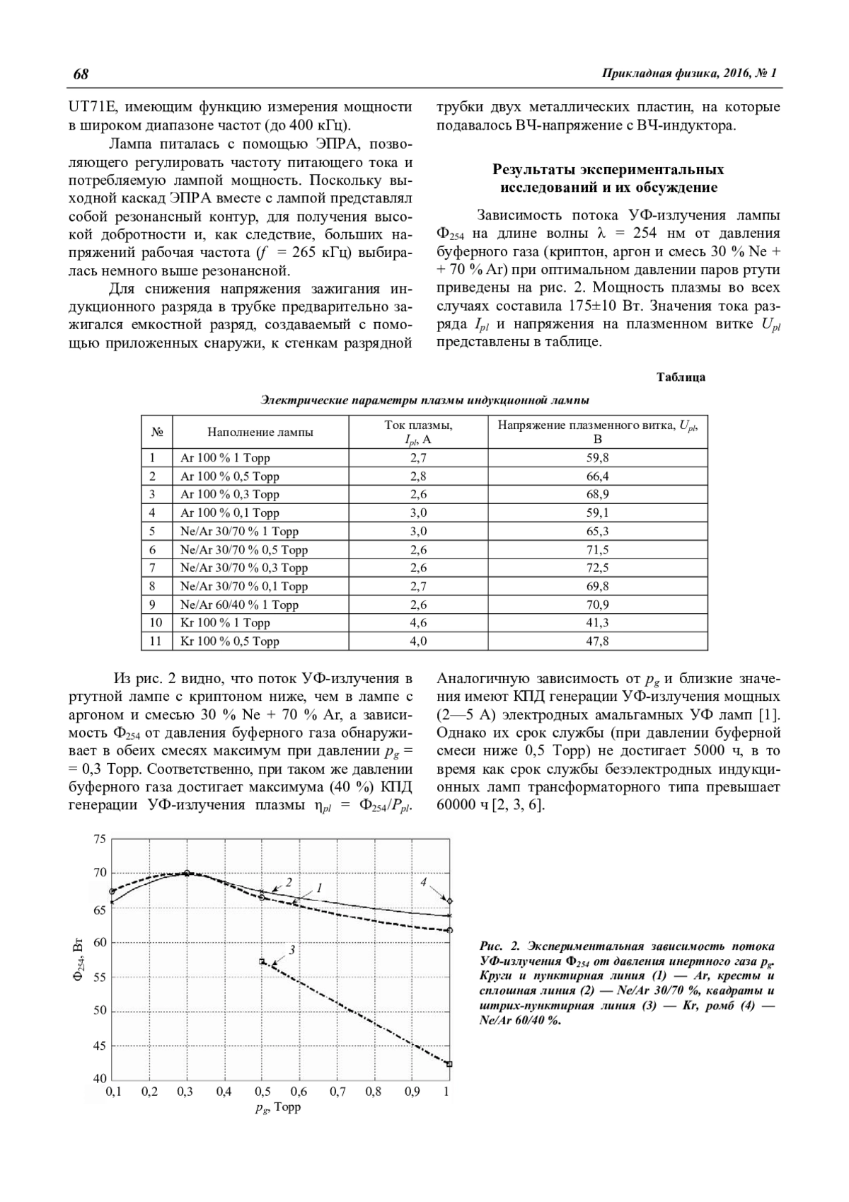 Индукционный разряд трансформаторного типа с двумя симметрично размещенными на лампе ВЧ-индукторами (магнитопровод и индуктивная катушка) возбуждался на частоте 265 кГц в замкнутой кварцевой трубке с внутренним диаметром 16,6 мм в смеси паров ртути и инертных газов (0,1—1,0 Торр). Обнаружено, что минимум КПД индуктора и максимумы напряженности электрического поля в плазме и потока УФ-излучения ( = 254 нм) достигаются при давлениях инертных газов 0,3—0,4 Торр.