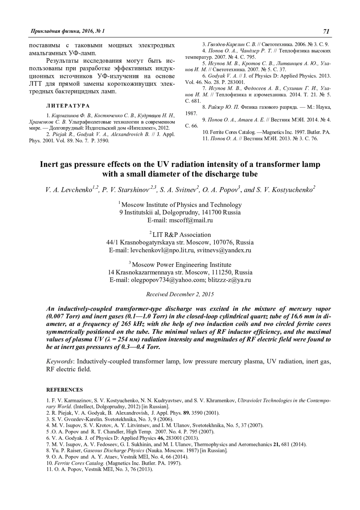 V. A. Panov, L. M. Vasilyak, S. P. Vetchinin, V. Ya. Pecherkin, and E. E. Son Spark channel propagation in a microbubble liquid 61 V. A. Levchenko, P. V. Starshinov, S. A. Svitnev, O. A. Popov, and S. V. Kostyuchenko Inert gas pressure effects on the UV radia-tion intensity of a transformer lamp with a small diameter of the discharge tube 66