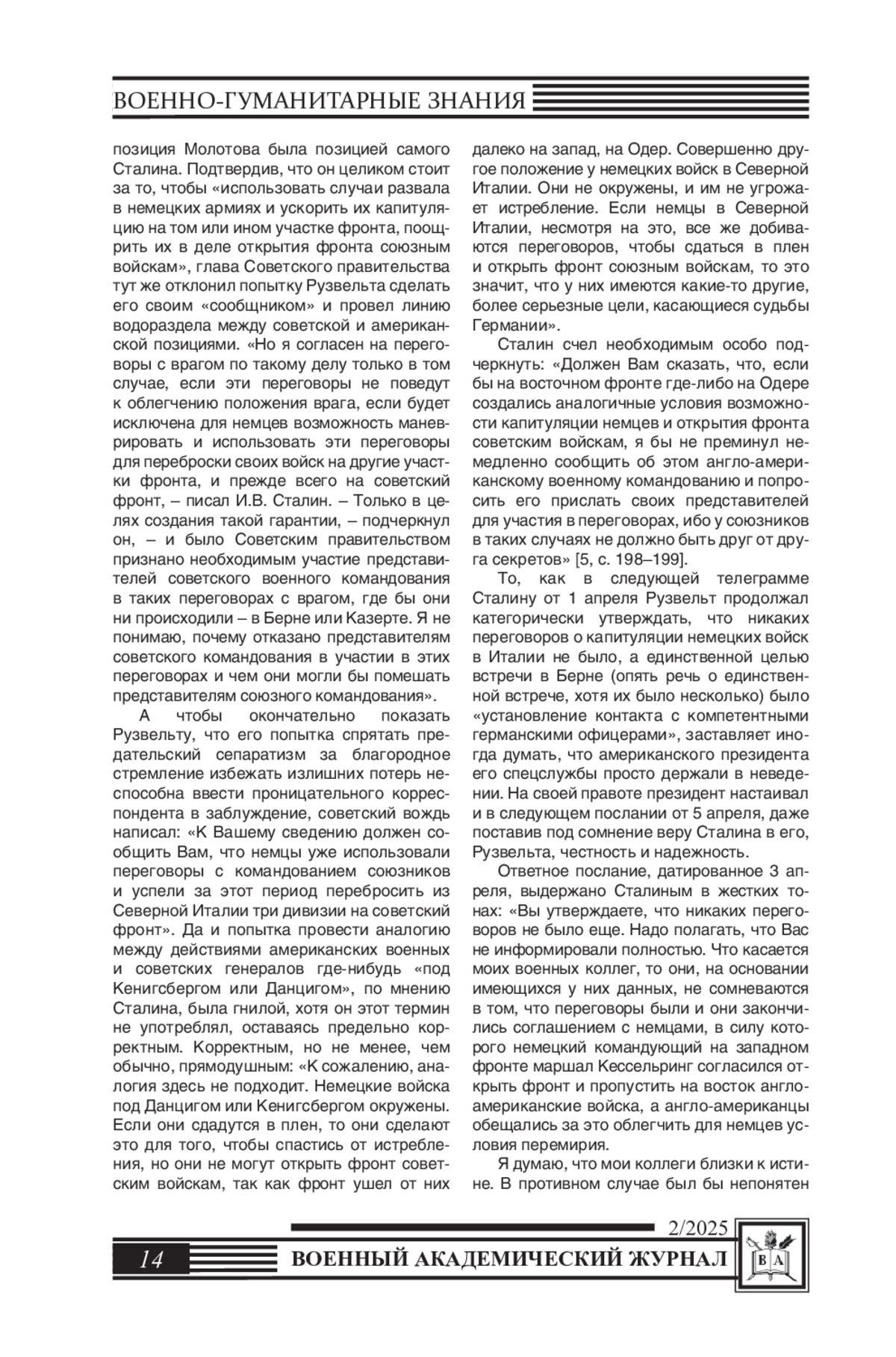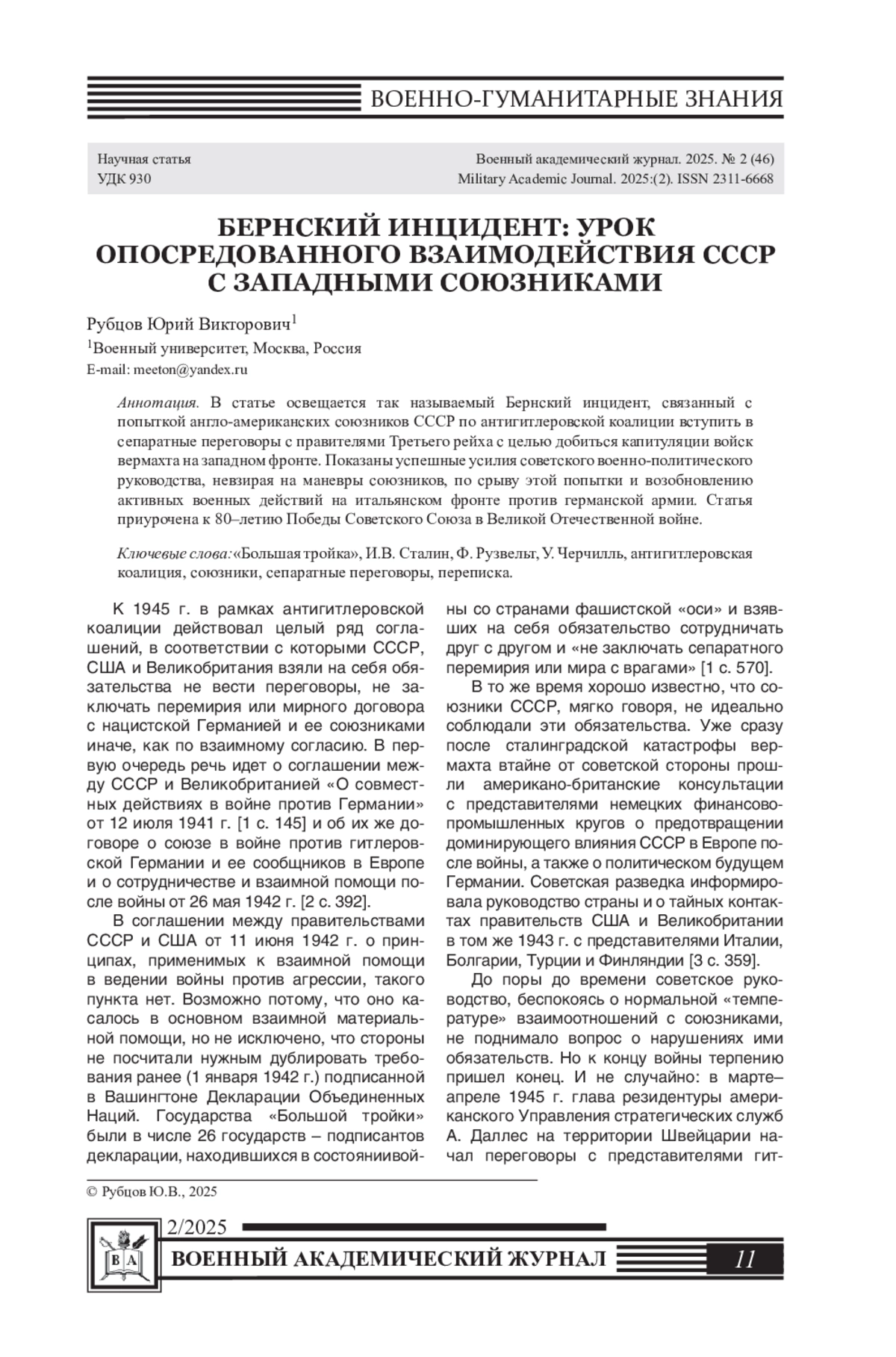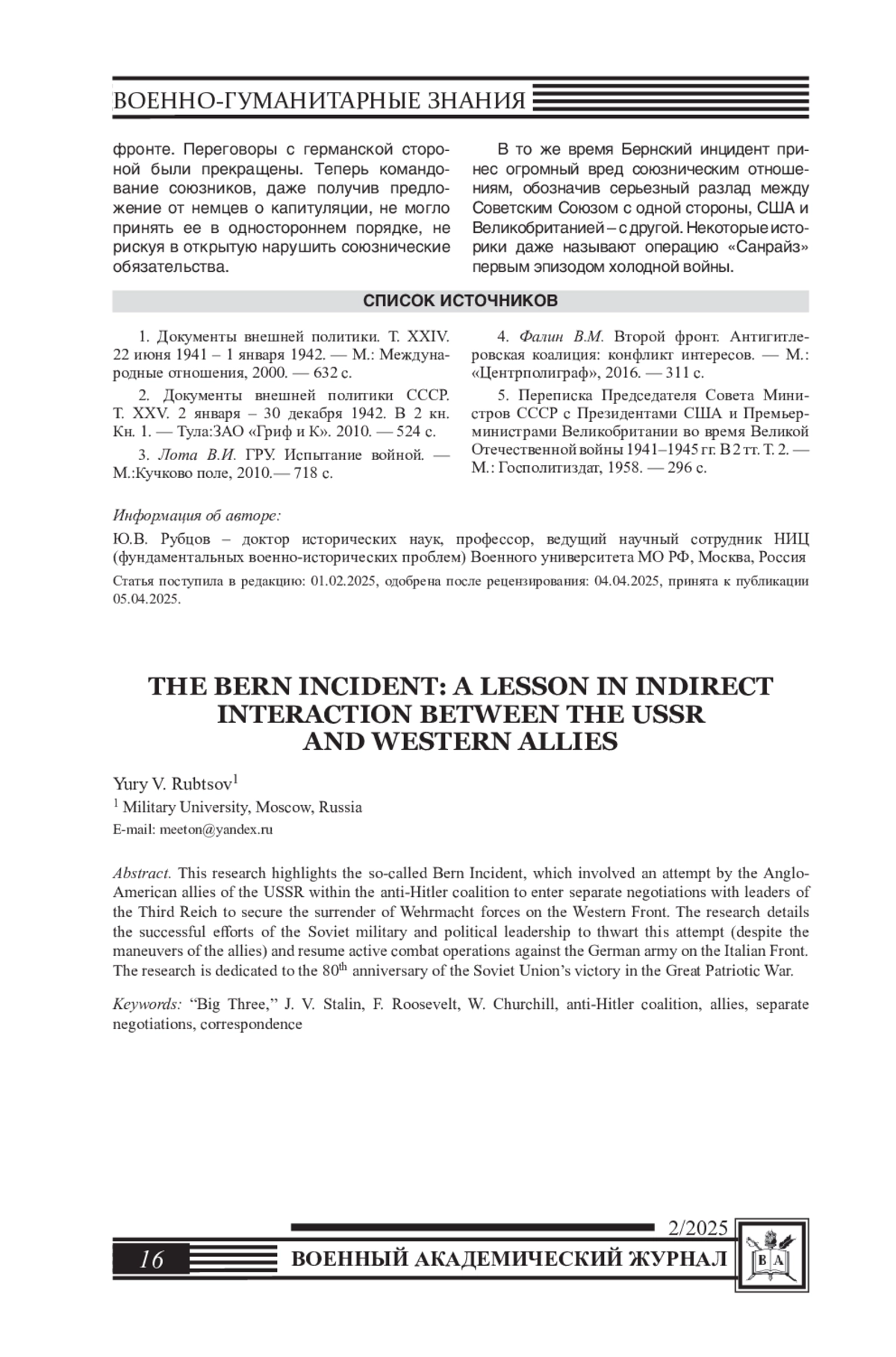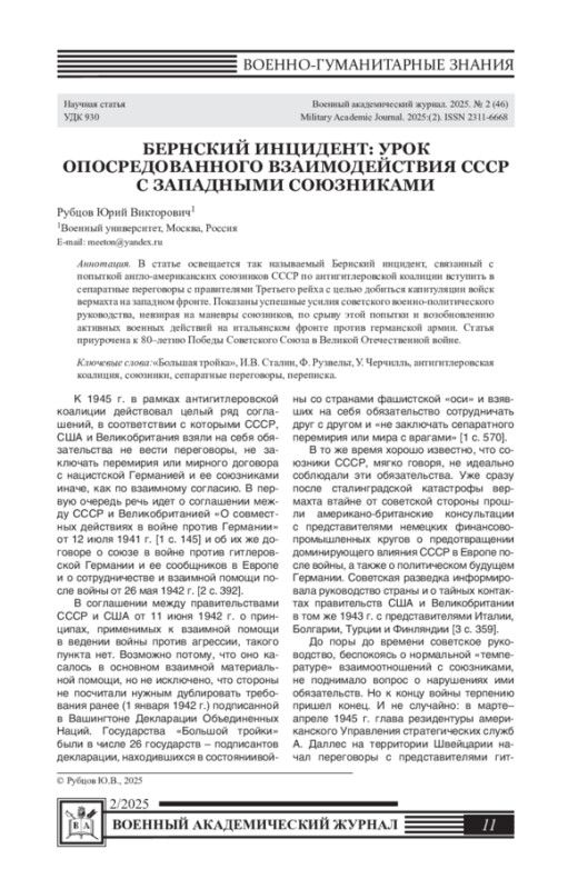 В статье освещается так называемый Бернский инцидент, связанный с попыткой англо-американских союзников СССР по антигитлеровской коалиции вступить в сепаратные переговоры с правителями Третьего рейха с целью добиться капитуляции войск вермахта на западном фронте. Показаны успешные усилия советского военно-политического руководства, невзирая на маневры союзников, по срыву этой попытки и возобновлению активных военных действий на итальянском фронте против германской армии. Статья приурочена к 80-летию Победы Советского Союза в Великой Отечественной войне.