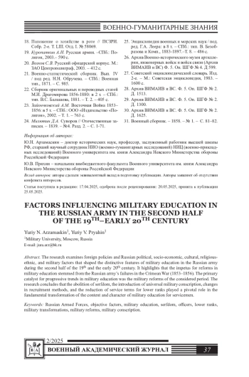 Статья посвящена рассмотрению внешнеполитических, внутриполитических, социально-экономических, культурных, религиозно-этнических и собственно военных факторов, определивших особенности воинского воспитания в русской армии во второй половине XIX - начале XX вв. Подчеркивается, что поводом для преобразований в области воинского воспитания послужили неудачи русской армии в Крымской войне (1853-1856 гг.), а главным катализатором прогрессивных тенденций воинского воспитания стали военные реформы исследуемого периода. Делается вывод, что первостепенную роль в коренной перестройке содержания и характера воинского воспитания военнослужащих сыграли отмена крепостного права, введение всеобщей воинской повинности, изменение способа комплектования и сокращение сроков воинской службы нижних чинов.