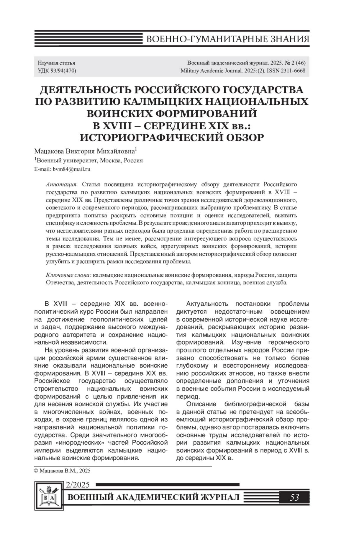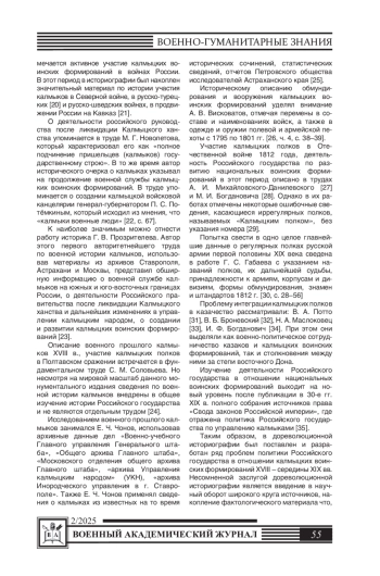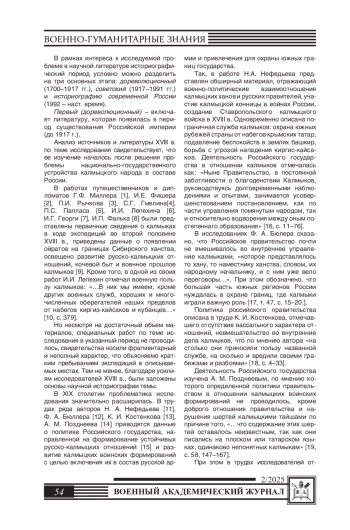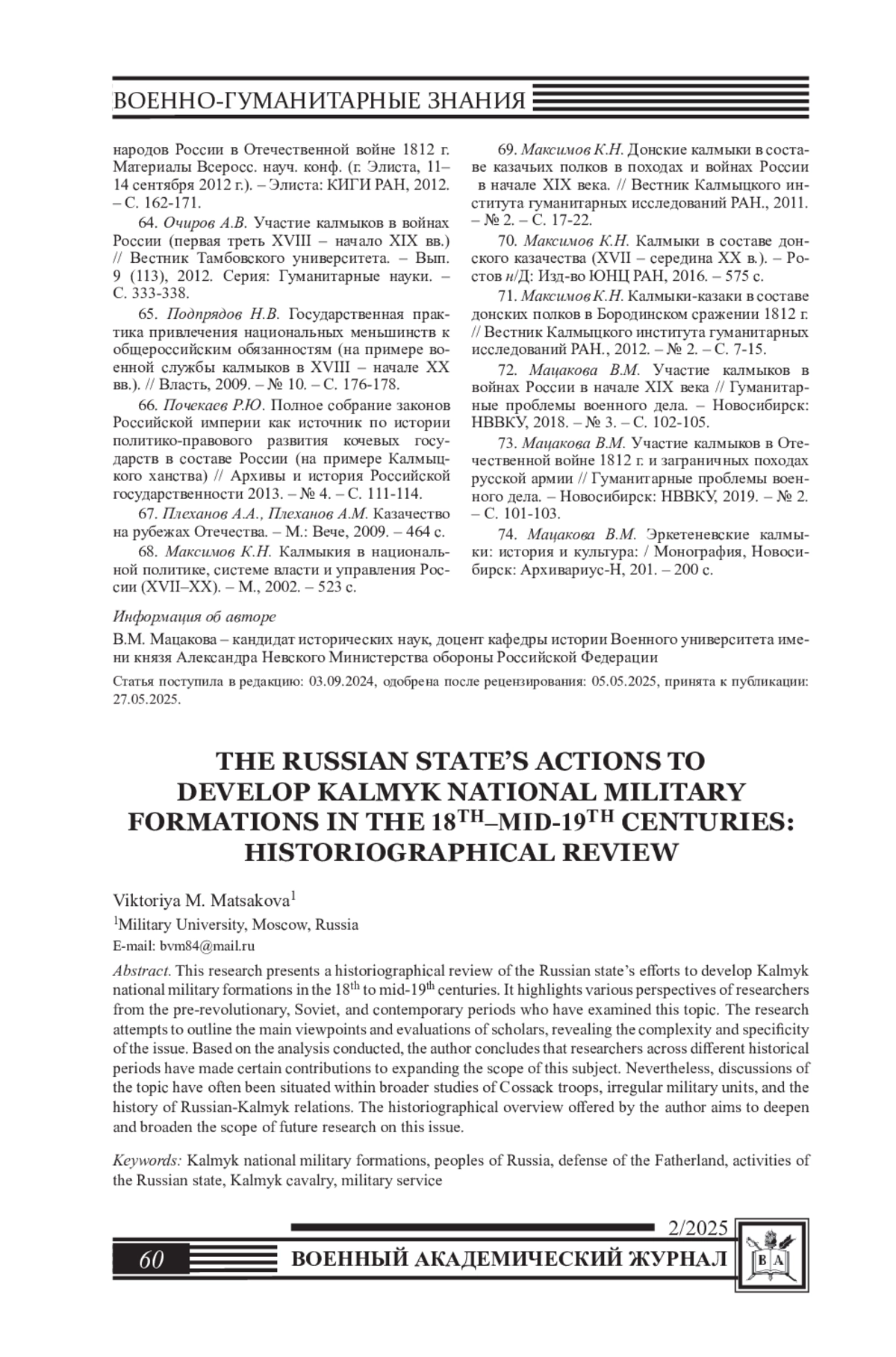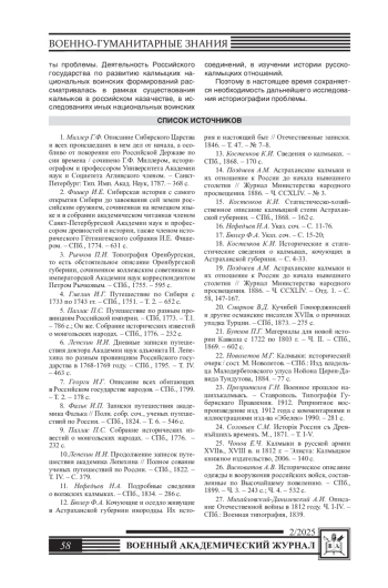 72. Мацакова В.М. Участие калмыков в войнах России в начале XIX века // Гуманитарные проблемы военного дела. - Новосибирск: НВВКУ, 2018. - № 3. - С. 102-105.