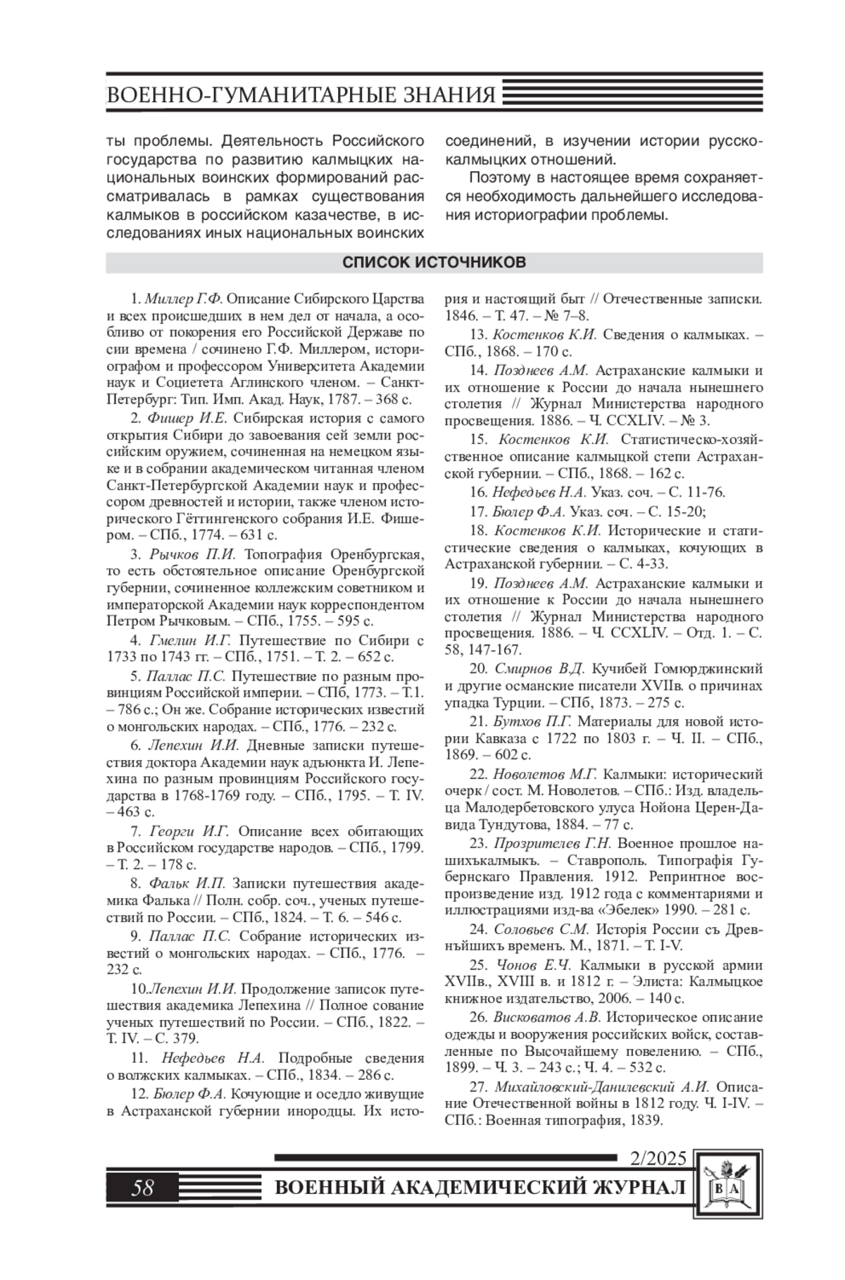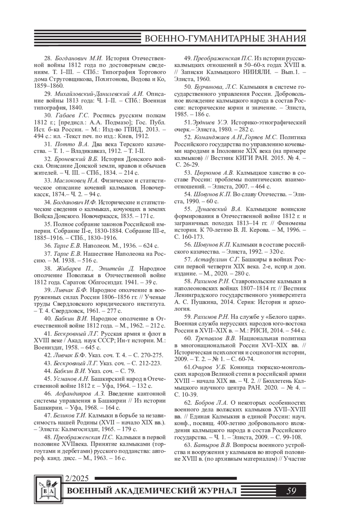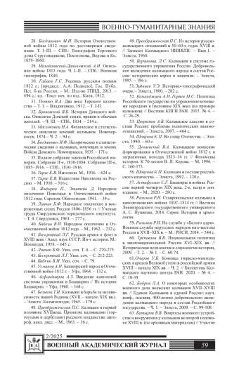 73. Мацакова В.М. Участие калмыков в Отечественной войне 1812 г. и заграничных походах русской армии // Гуманитарные проблемы военного дела. - Новосибирск: НВВКУ, 2019. - № 2. - С. 101-103.
