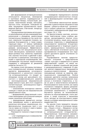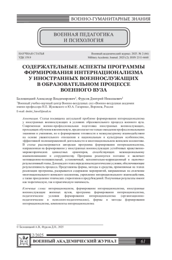 Статья посвящена актуальной проблеме формирования интернационализма у иностранных военнослужащих в условиях образовательного процесса военного вуза. Современная военно-профессиональная подготовка иностранных военнослужащих, проходящих обучение в военном вузе, предполагает не только овладение профессиональными знаниями и умениями, но и формирование готовности к межкультурному взаимодействию на основе уважительного отношения к национальным и культурным особенностям, эффективной полинаправленной деятельности в многонациональном воинском коллективе. В статье рассматривается авторская программа формирования интернационализма, направленная на формирование у иностранных военнослужащих устойчивых нравственно-мировоззренческих ценностных ориентиров, способствующих межнациональному взаимопониманию и сотрудничеству. Программа реализуется поэтапно и включает мотивационно-познавательный, установочный, исполнительно-коррекционный и оценочно-результативный этапы. Для каждого этапа определены педагогические условия, обеспечивающие результативность процесса. Представлены формы, методы и средства, применяемые на этапах реализации программы, раскрывается содержание мероприятий, направленных на сплочение многонационального воинского коллектива, укрепление интернационального взаимодействия, а также преодоление этнических стереотипов и предубеждений. Полученные результаты имеют как теоретическую, так и практическую значимость.
