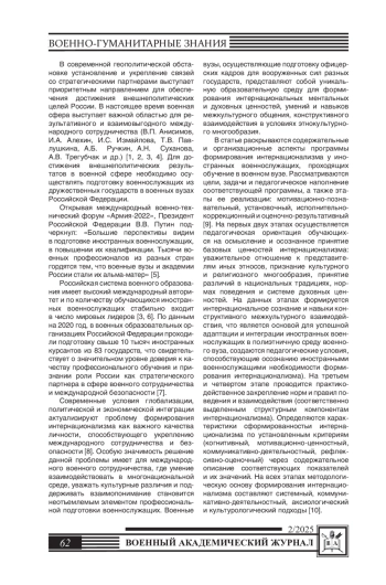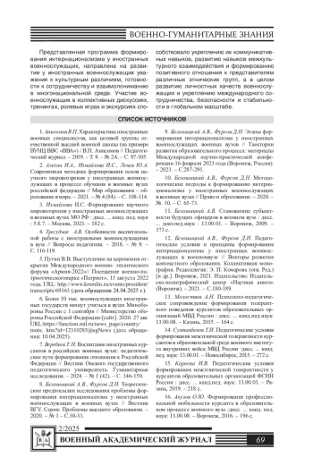9. Белошицкий А.В., Фурсов Д.Н. Этапы формирования интернационализма у иностранных военнослужащих военных вузов // Траектории развития образовательного процесса: материалы Международной научно-практической конференции 16 февраля 2023 года (Воронеж, Россия). - 2023. - С.287-291. EDN: PQQJMP