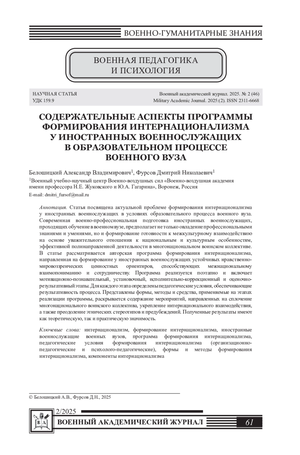 10. Белошицкий А.В., Фурсов Д.Н. Методологические подходы к формированию интернационализма у иностранных военнослужащих в военных вузах // Право и образование. - 2020. - №. 10. - С. 65-73. EDN: ROQZZV