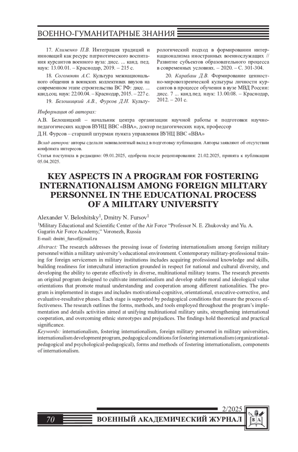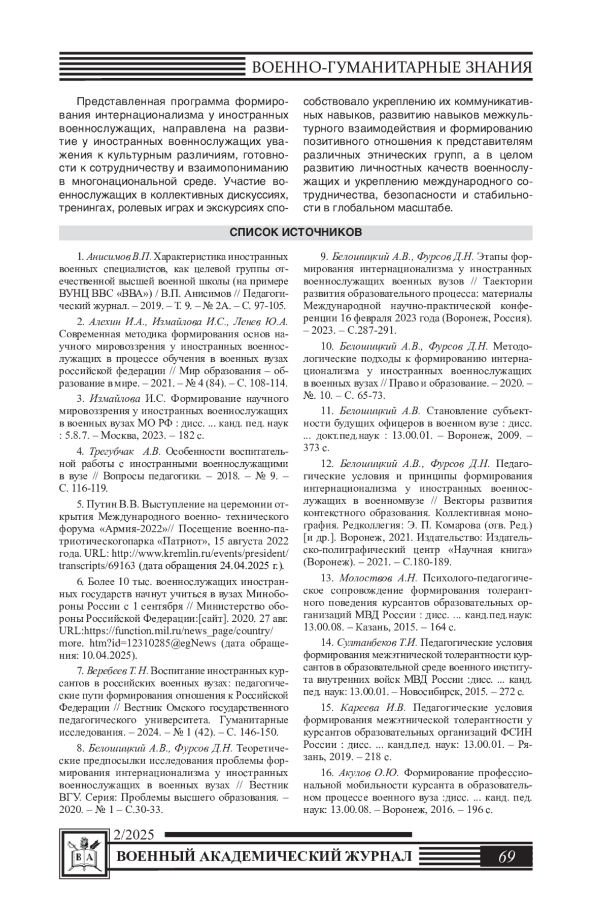8. Белошицкий А.В., Фурсов Д.Н. Теоретические предпосылки исследования проблемы формирования интернационализма у иностранных военнослужащих в военных вузах // Вестник ВГУ. Серия: Проблемы высшего образования. - 2020. - № 1 - С.30-33.