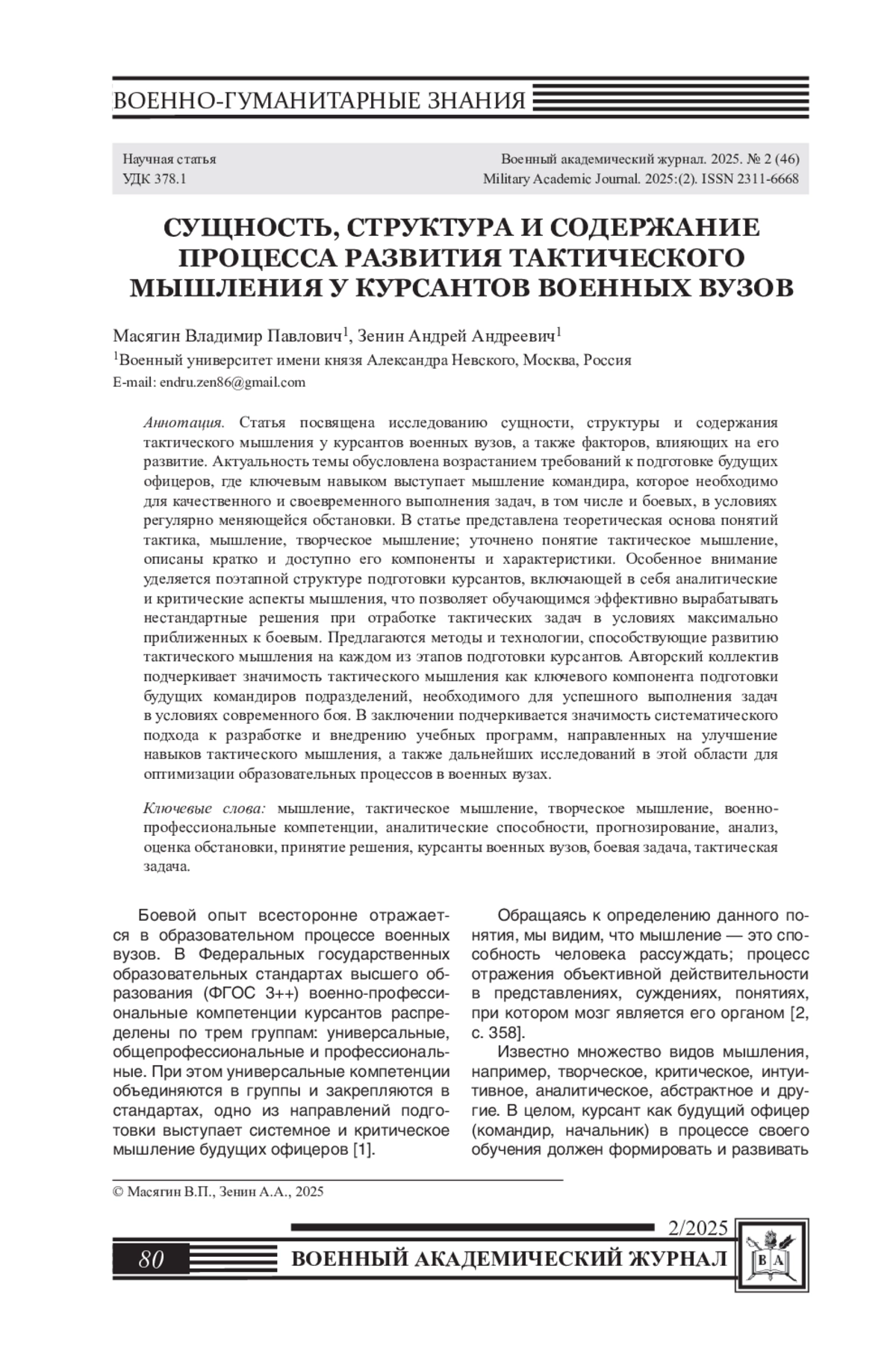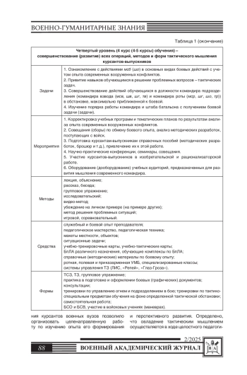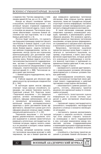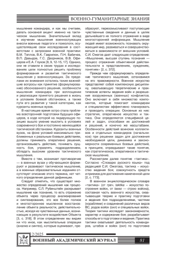 Статья посвящена исследованию сущности, структуры и содержания тактического мышления у курсантов военных вузов, а также факторов, влияющих на его развитие. Актуальность темы обусловлена возрастанием требований к подготовке будущих офицеров, где ключевым навыком выступает мышление командира, которое необходимо для качественного и своевременного выполнения задач, в том числе и боевых, в условиях регулярно меняющейся обстановки. В статье представлена теоретическая основа понятий тактика, мышление, творческое мышление; уточнено понятие тактическое мышление, описаны кратко и доступно его компоненты и характеристики. Особенное внимание уделяется поэтапной структуре подготовки курсантов, включающей в себя аналитические и критические аспекты мышления, что позволяет обучающимся эффективно вырабатывать нестандартные решения при отработке тактических задач в условиях максимально приближенных к боевым. Предлагаются методы и технологии, способствующие развитию тактического мышления на каждом из этапов подготовки курсантов. Авторский коллектив подчеркивает значимость тактического мышления как ключевого компонента подготовки будущих командиров подразделений, необходимого для успешного выполнения задач в условиях современного боя.