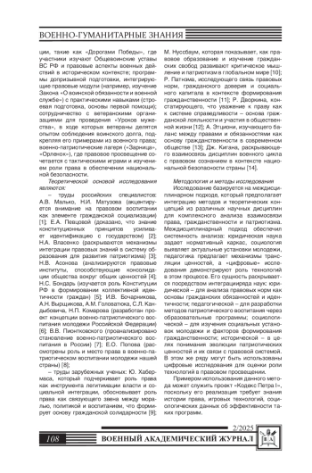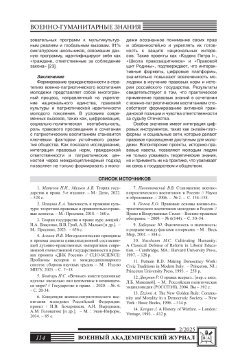17. Кульбачевская О.В. Патриотизм молодежи как стратегический ресурс развития России: потенциал, вызовы, риски // Вестник антропологии. - 2023. - № 4. - С. 20-36. EDN: PUKQAL