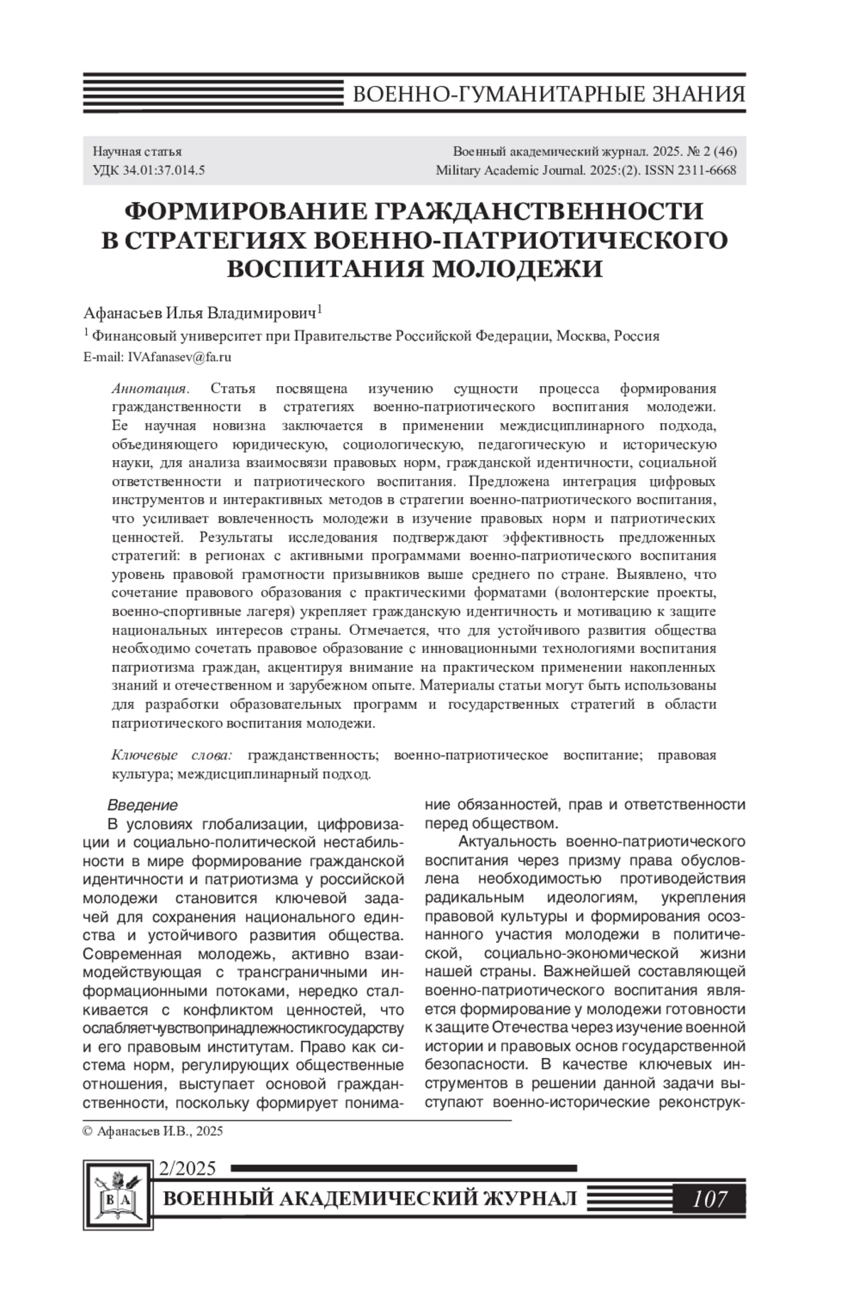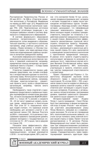 Статья посвящена изучению сущности процесса формирования гражданственности в стратегиях военно-патриотического воспитания молодежи. Ее научная новизна заключается в применении междисциплинарного подхода, объединяющего юридическую, социологическую, педагогическую и историческую науки, для анализа взаимосвязи правовых норм, гражданской идентичности, социальной ответственности и патриотического воспитания. Предложена интеграция цифровых инструментов и интерактивных методов в стратегии военно-патриотического воспитания, что усиливает вовлеченность молодежи в изучение правовых норм и патриотических ценностей. Результаты исследования подтверждают эффективность предложенных стратегий: в регионах с активными программами военно-патриотического воспитания уровень правовой грамотности призывников выше среднего по стране. Выявлено, что сочетание правового образования с практическими форматами (волонтерские проекты, военно-спортивные лагеря) укрепляет гражданскую идентичность и мотивацию к защите национальных интересов страны. Отмечается, что для устойчивого развития общества необходимо сочетать правовое образование с инновационными технологиями воспитания патриотизма граждан, акцентируя внимание на практическом применении накопленных знаний и отечественном и зарубежном опыте. Материалы статьи могут быть использованы для разработки образовательных программ и государственных стратегий в области патриотического воспитания молодежи.