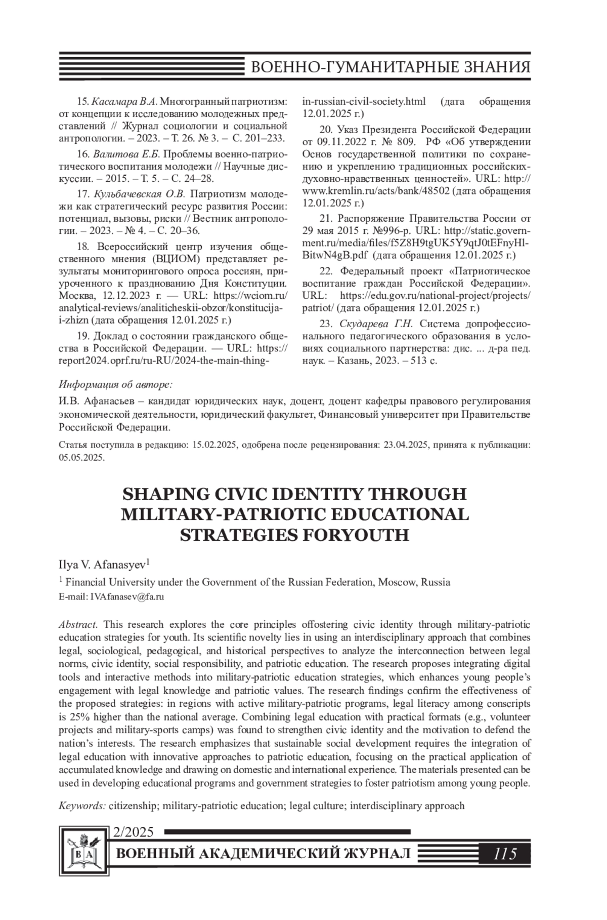 15. Касамара В.А. Многогранный патриотизм: от концепции к исследованию молодежных представлений // Журнал социологии и социальной антропологии. - 2023. - Т. 26. № 3. - С. 201-233. EDN: ZJUHZQ
