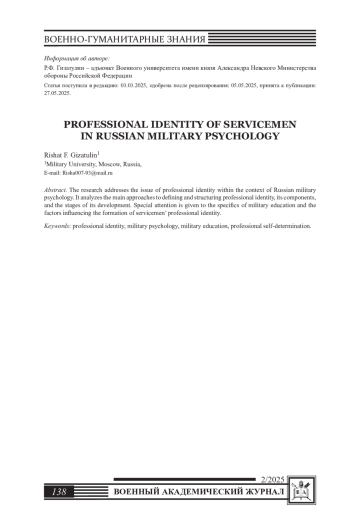 В статье рассматривается проблема профессиональной идентичности в контексте отечественной военной психологии. Анализируются основные подходы к определению и структуре профессиональной идентичности, ее компоненты и этапы формирования. Особое внимание уделяется специфике военного образования и факторам, влияющим на становление профессиональной идентичности военнослужащих.