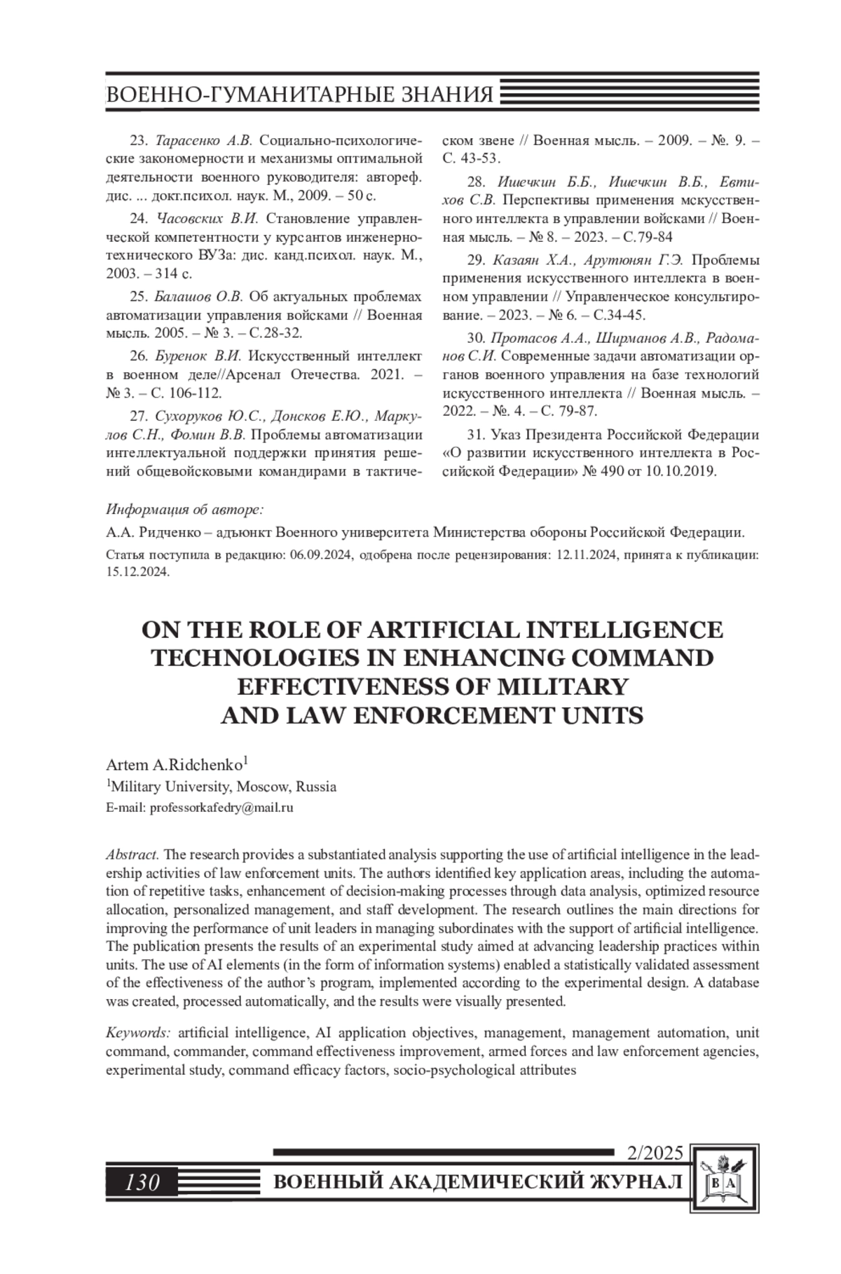 31. Мерзляк Л.Е. Формирование готовности у курсантов военных училищ сухопутных войск к руководству подразделениями: дис. …канд. психол. наук. М.,1979. - 209 с. EDN: NPQTGF